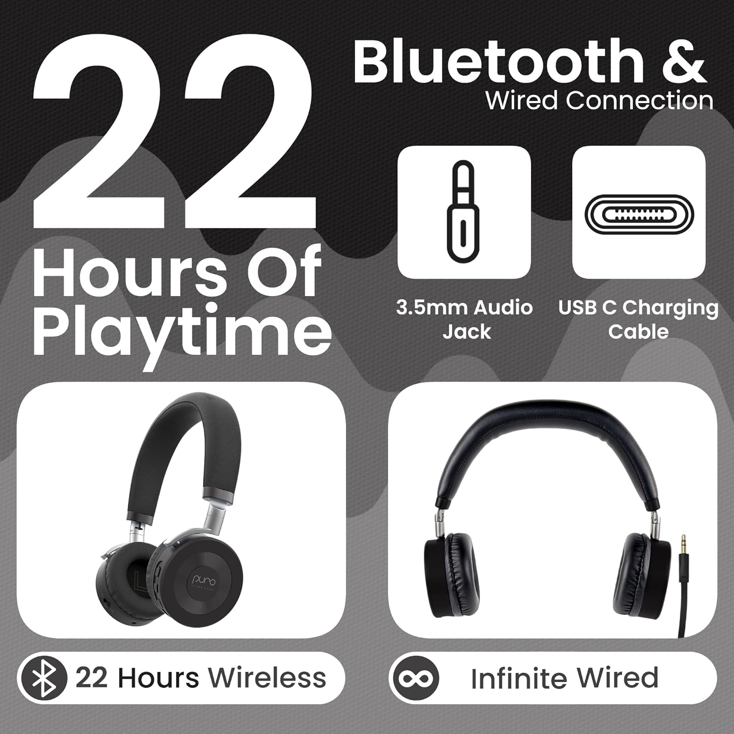 Puro Sound Labs JuniorJam Plus Volume-Limiting Wireless Bluetooth Headphones for Kids, Secure Audio with Adjustable On-Ear Design, 22-Hour Battery, Ideal for Tablets, Smartphones & PCs - Black