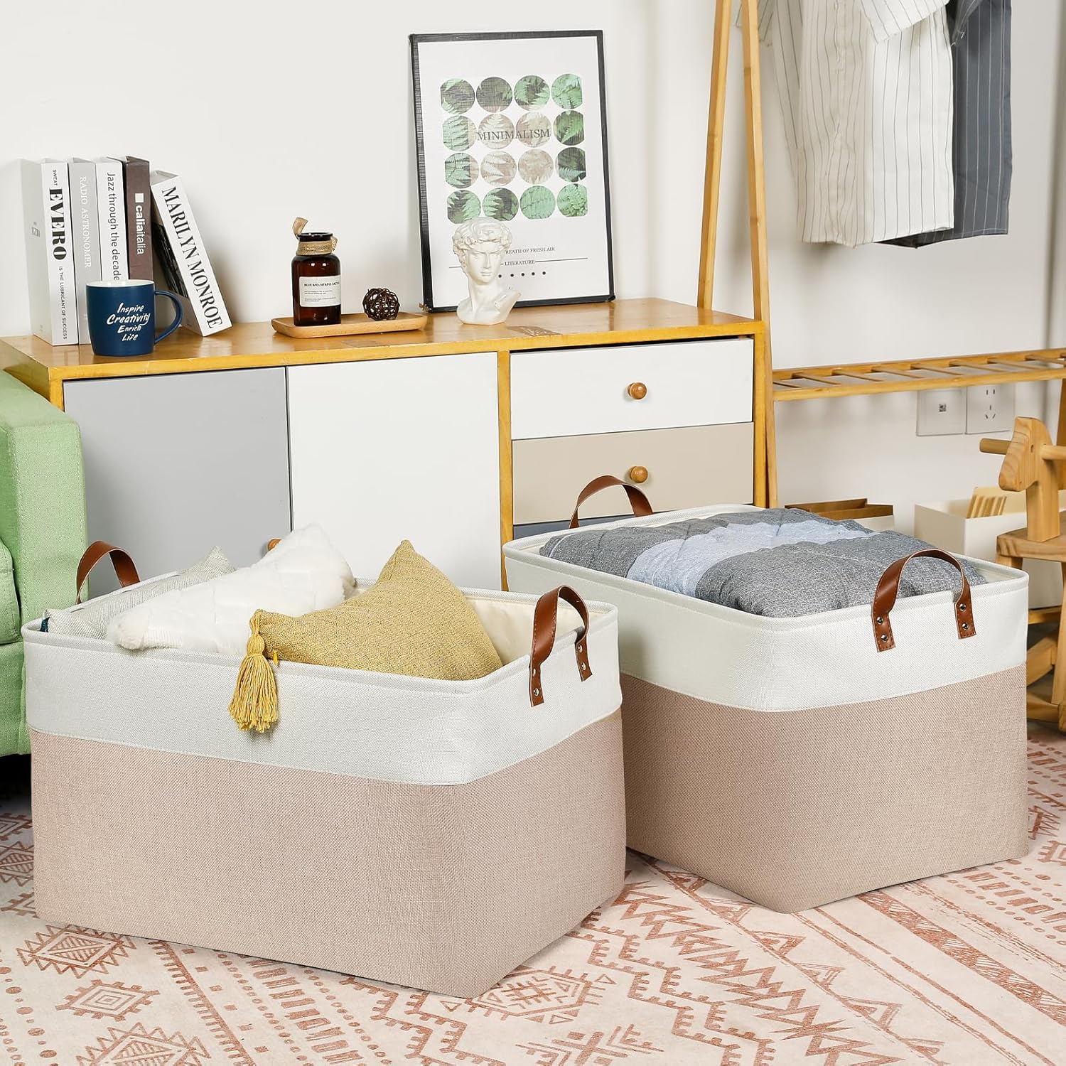 - 【Unique Design & Modern & Decorative】Set of 2 large storage baskets, dimensions(each): 22(L) x 15(W) x 13(H) inches. Fabric baskets for organizing bring you organizing convenience and a sweet home. Great for socks, underwear, books, magazines, toys, baby clothes, pet products, wipes, towels, decorations, office supplies, DVDs, and gifts. The Large Fabric baskets with neutral colors can match a lot of home styles - keeping your home nice and tidy.