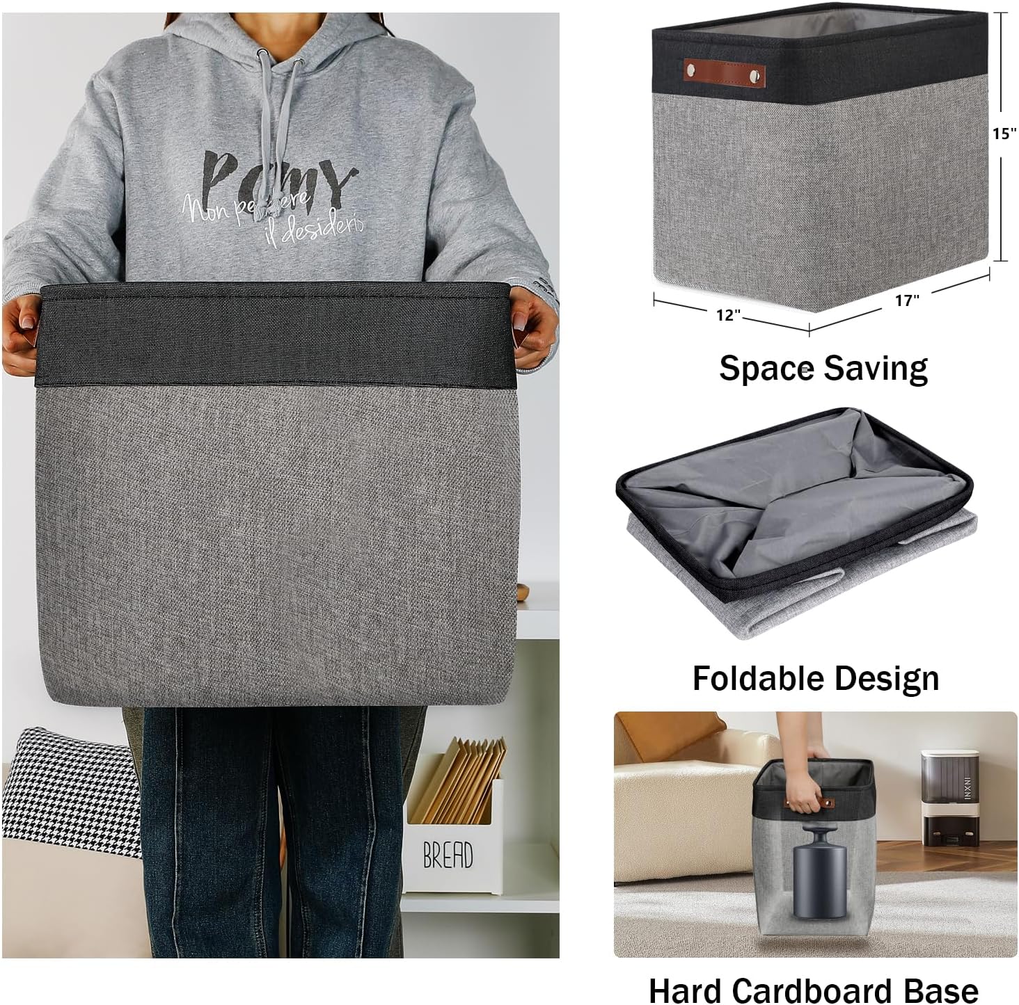 - 【Unique Design & Modern & Decorative】Set of 2 large storage baskets, dimensions(each): 17(L) x 12(W) x 15(H) inches. Collapsible storage baskets bring you organizing convenience and a sweet home. Great for socks, underwear, books, magazines, toys, baby clothes, pet products, wipes, towels, decorations, office supplies, DVDs, and gifts. The fabric baskets with neutral colors can match a lot of home styles - keeping your home nice and tidy.