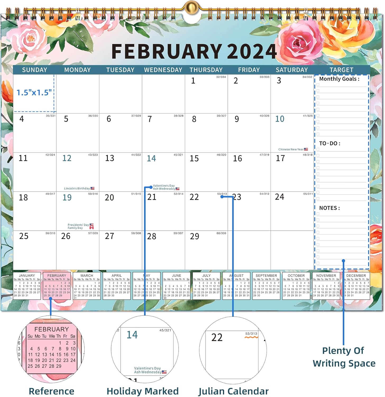 - Maximize your year with festival reminders, sticker attachments, monthly planning, and space for to-do lists.