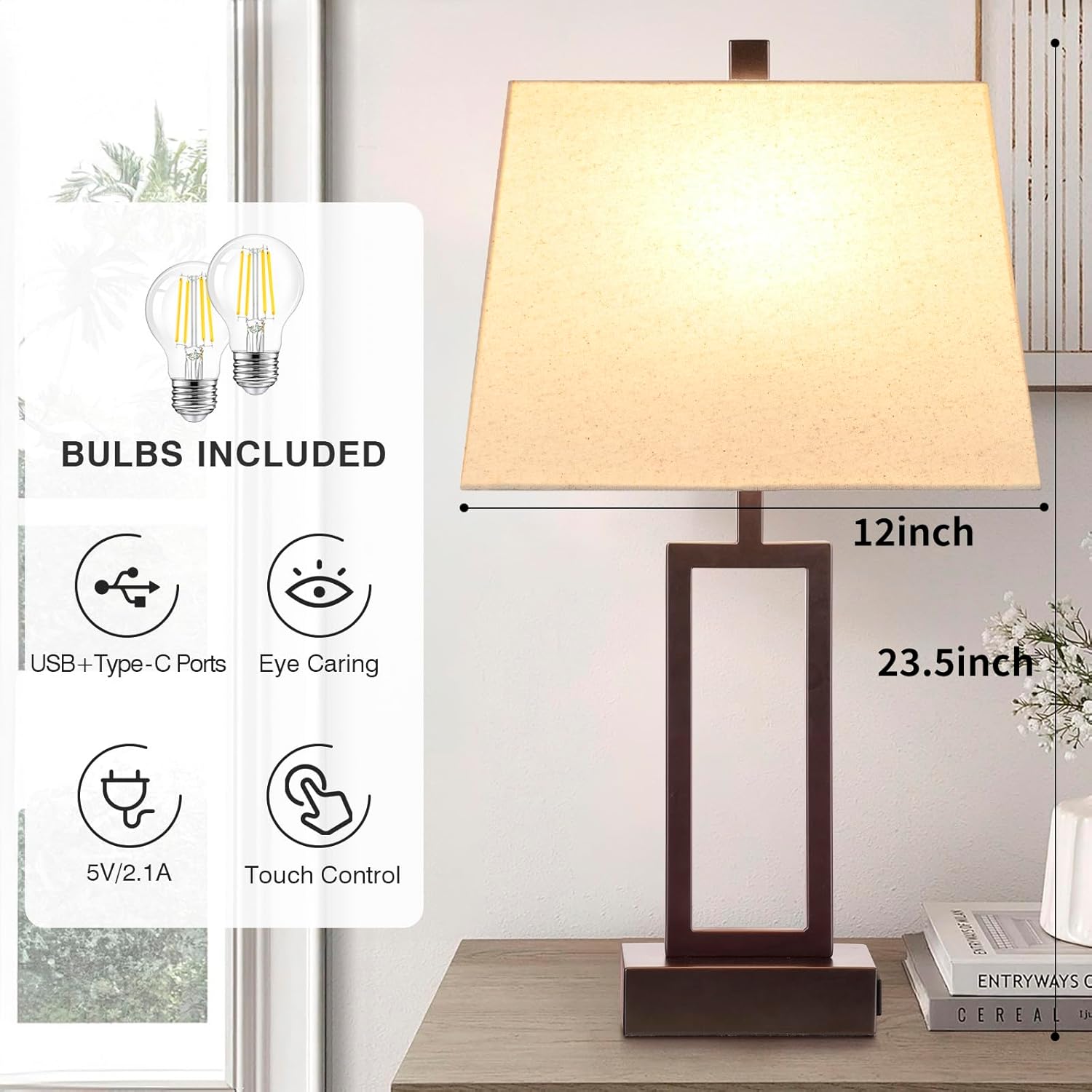 23.5" Touch Control Table Lamps, Metal Bedside Lamp for Bedroom Set of 2 with USB A+C Ports & AC Outlet, 3-Way Dimmable Nightstand Lamp for Living Room (LED Bulb Included)