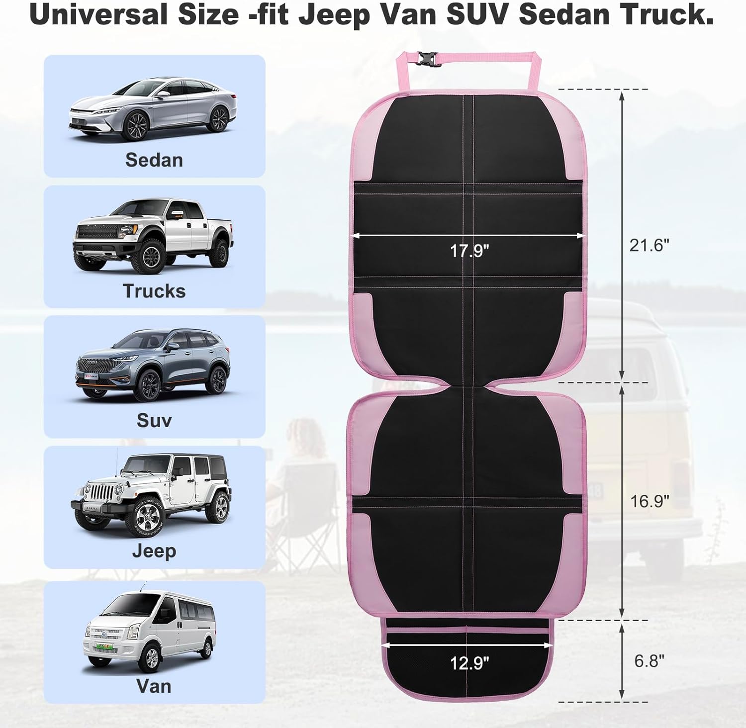 - The whole dimension of the auto seat protector carseat is 17.9 x 46.45 inch, the seat:17.9 x 16.9 inch, the back: 17.9 x 21.6 inch, and the mesh pocket: 12.9 x 6.8 inch. Universal fit Jeep Van SUV Truck