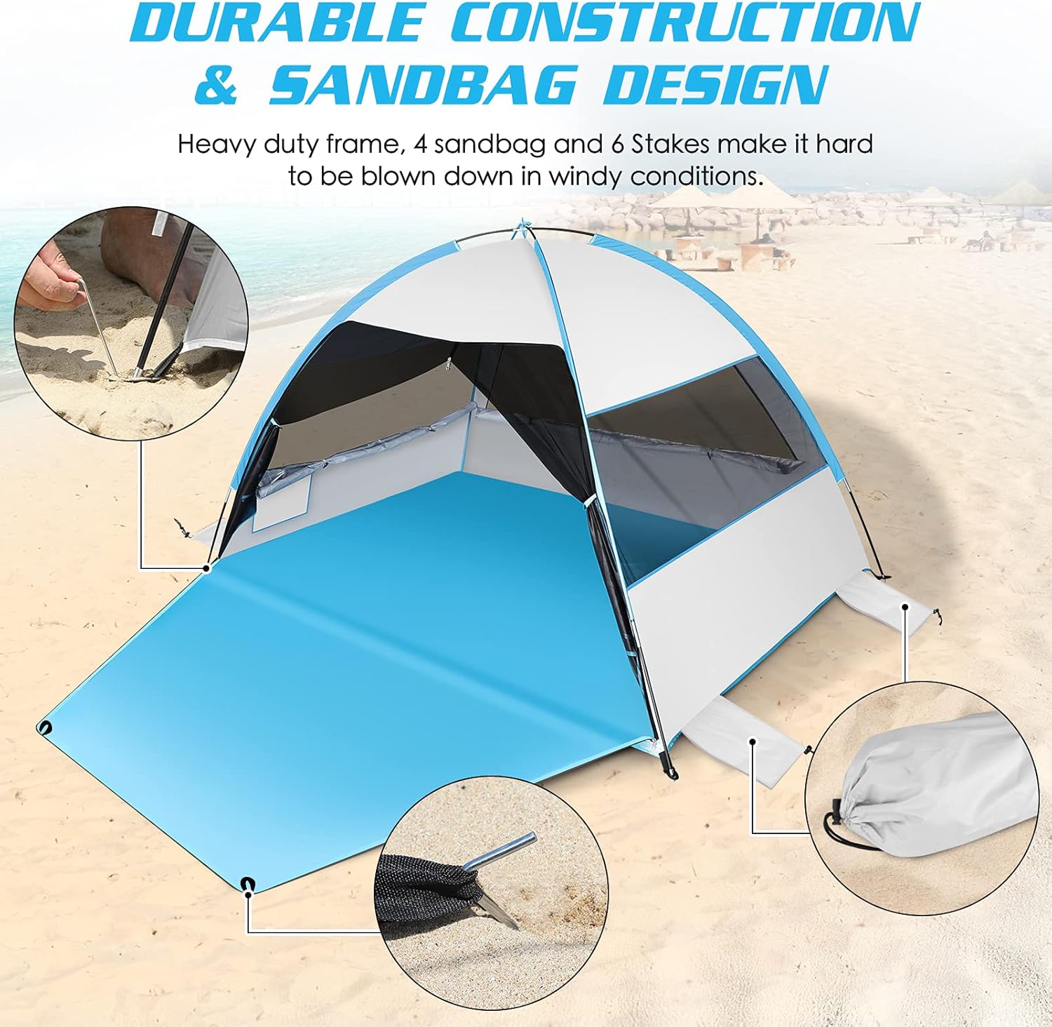 Large Easy Setup Beach Tent,Anti-UV Beach Shade Beach Canopy Tent Sun Shade with Extended Floor & 3 Mesh Roll Up Windows Fits 3-4 Person,Portable Shade Tent for Outdoor Camping Fishing
