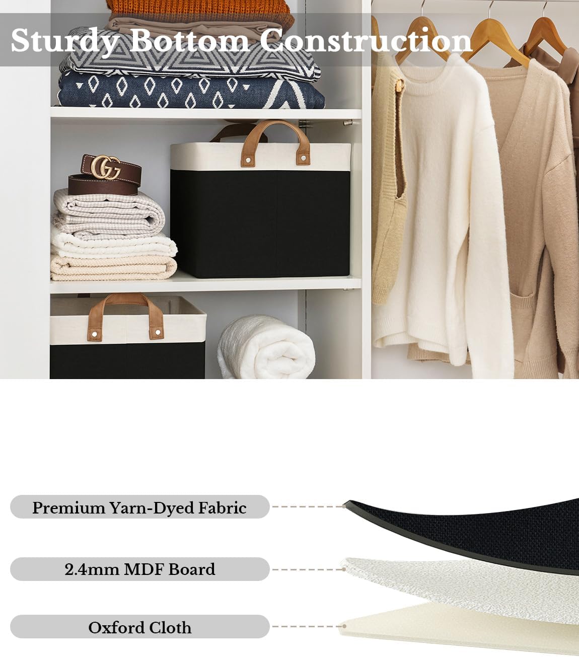 - Premium Quality: Made from high-quality fabric and reinforced with a heavy-duty MDF bottom board and a sturdy metal frame. The solid construction enables the storage bins to stand upright without support, even when empty.