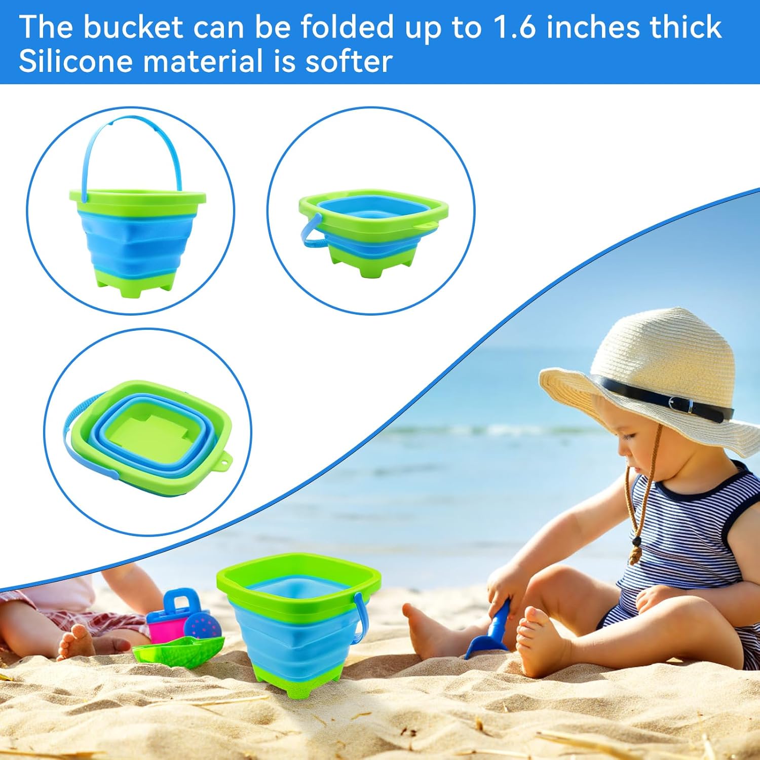 - Foldable Sand Bucket: The bucket can be foldable to a thickness of 1.6 inches, portable and lightweight, made of silicone and high-quality plastic, small and cute, not for large fish