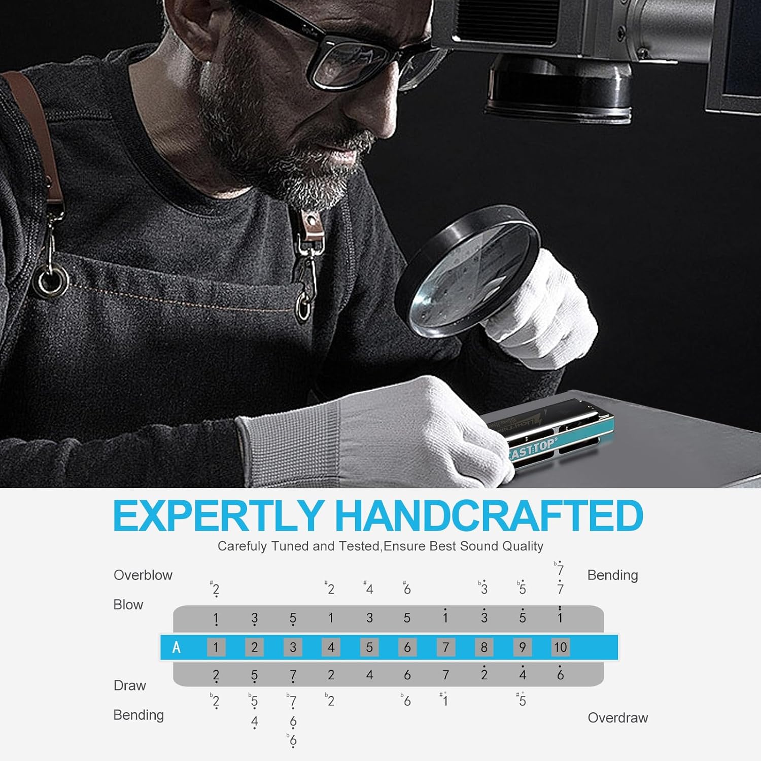 East Top 10 Hole Professional Diatonic Harmonica, Key of A, Blues Harp Mouth Organ, Brass, Perfect for Adults, Professionals and Students