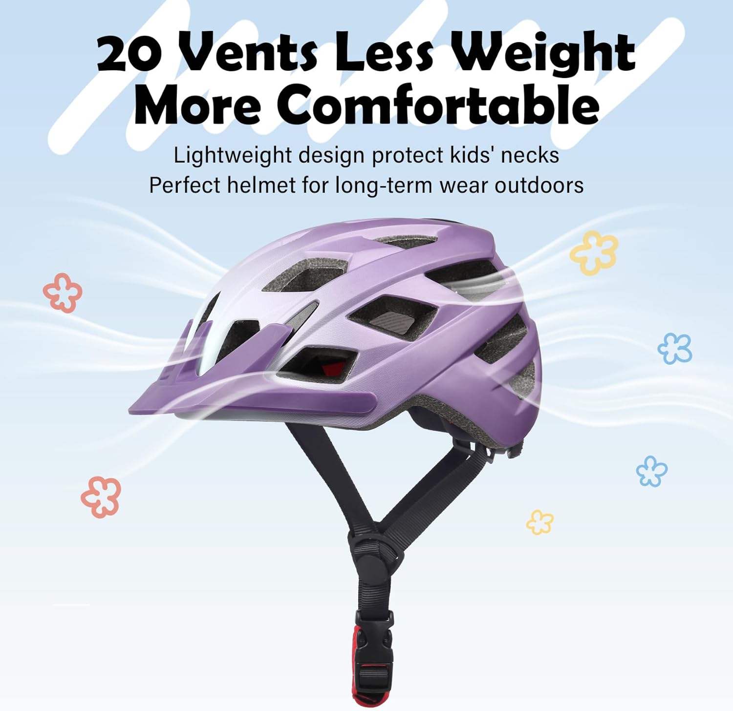 - Lightweight : Our kids bike helmet is ultra light just 255 g/0.55lb with 20 vents for less sweat and a more comfortable cycling even on hot summer days