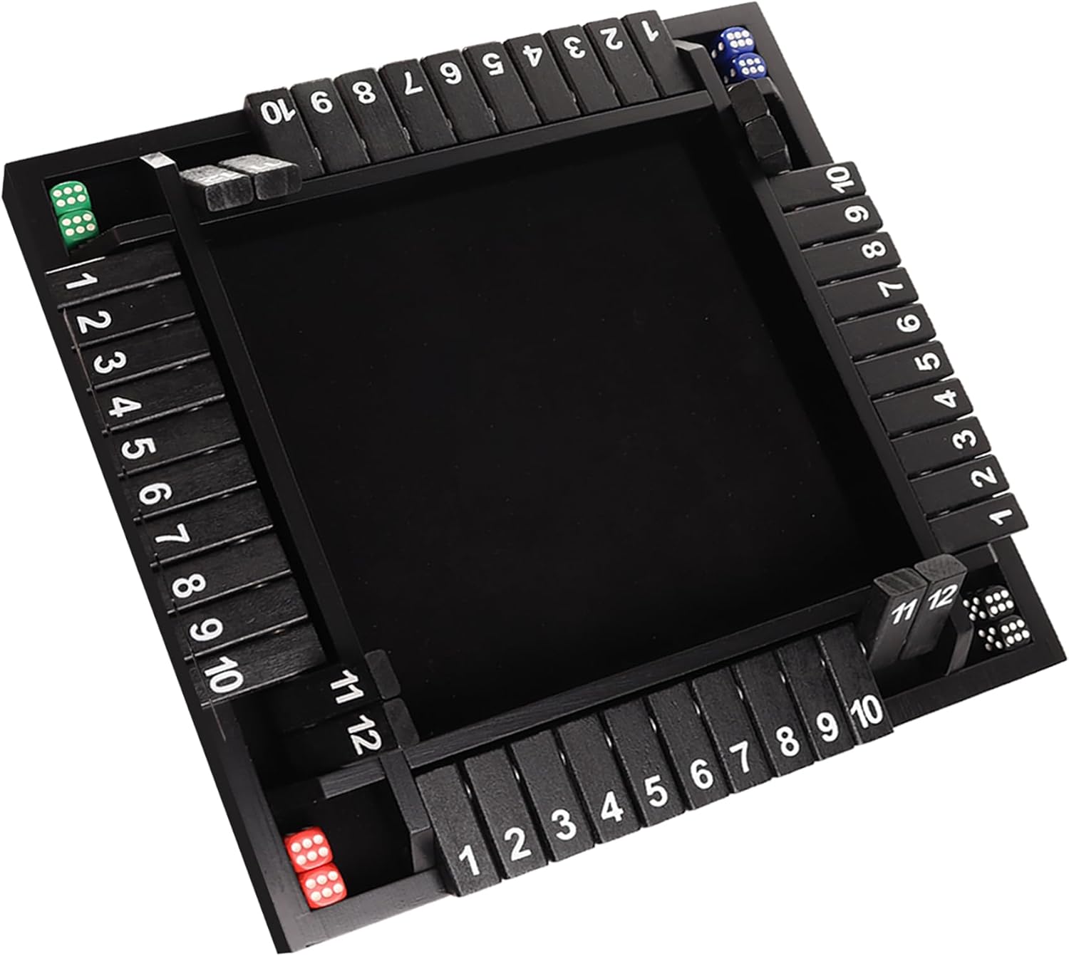 - Four-Way Shut The Box: Since the set is designed for two to four players, it includes four pairs of four different colored dice (black, red, blue, green) and a set of instructions that will teach rules, strategies, and how to win the game
