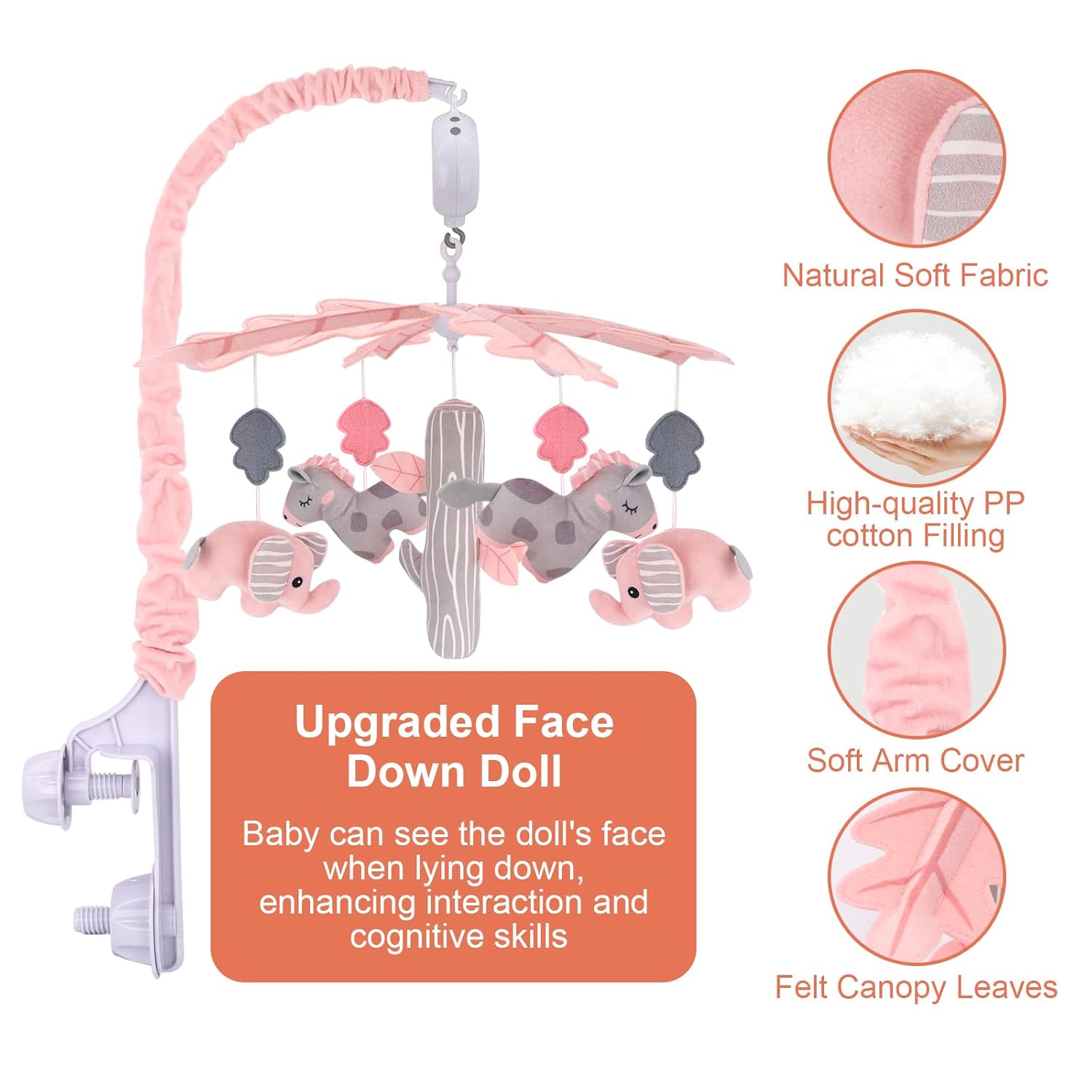 Upgraded Blublu Park Musical Mobile for Crib, Baby Crib Mobile with Hanging Rotating Toys Woodland Nursery Decor for Newborn Baby Boys Girls, Digital Music Box with 3 Modes, 12 Lullabies (Pink)