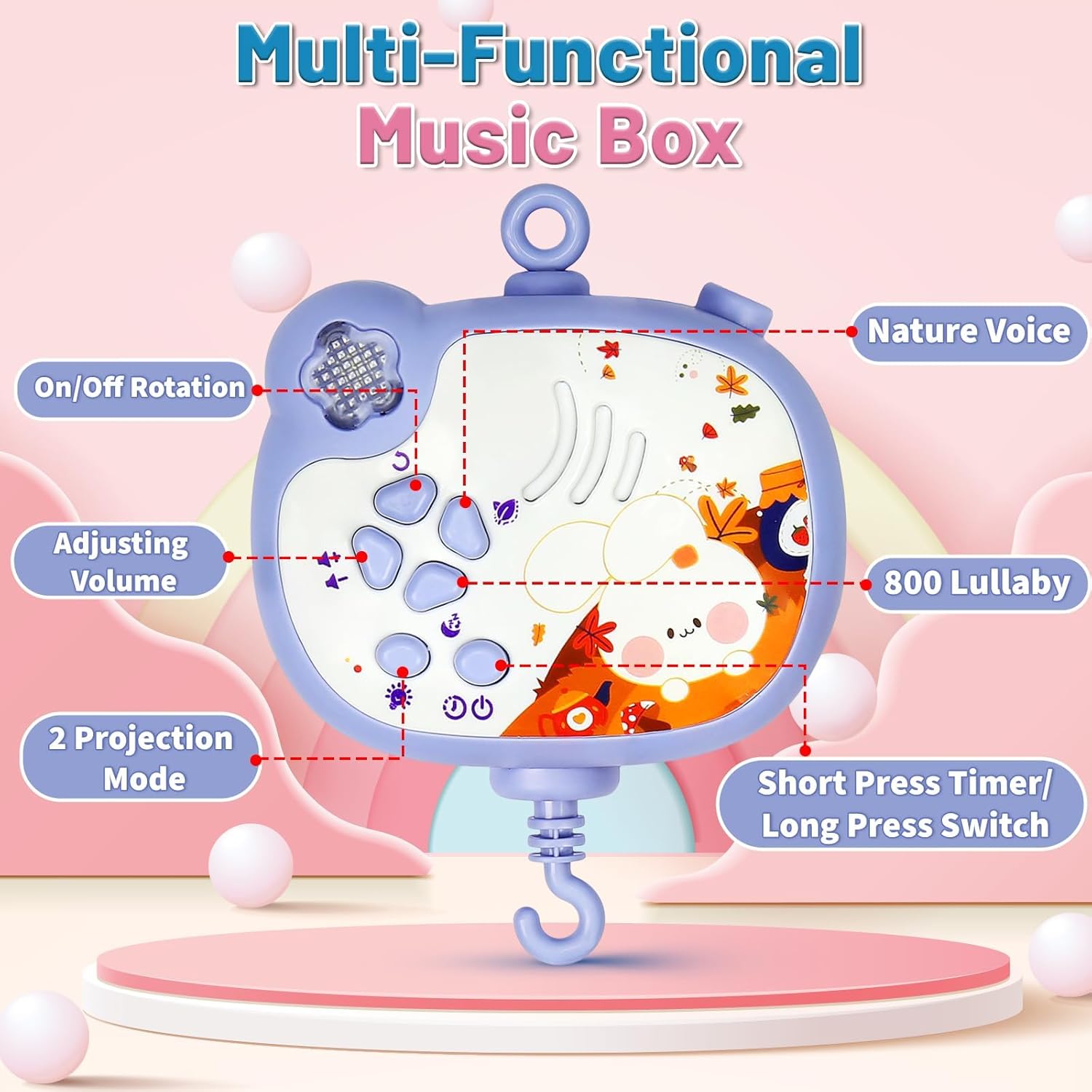 - 【Baby Crib Toys】: Baby Mobile includes a music box with adjustable volume and soft lighting that plays lullabies. With the soft music, the animal rattles slowly rotate to accompany and soothe your baby to a sweet sleep.