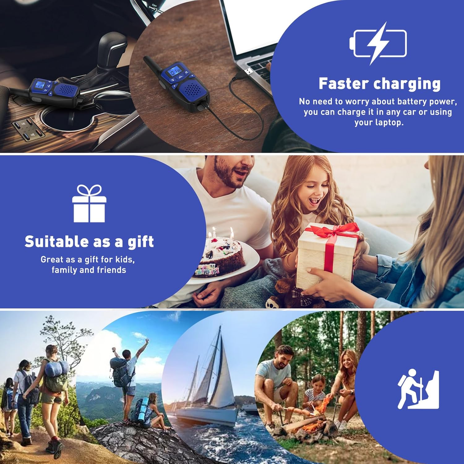 - RECHARGEABLE WALKIE TALKIES:Powered by 3 AA 1000mah batteries, low battery alert to avoid mid-communication drop-offs and static noise, automatic power-saving to extend battery life and entertainment time. (2x 3 AA 1000mah batteries、2 x Family Walkie Talkies、1 x micro USB charging cable、 2 x new lanyard 、2 x belt clips、1 x User's Manual、1x Exquisite Gift Box).