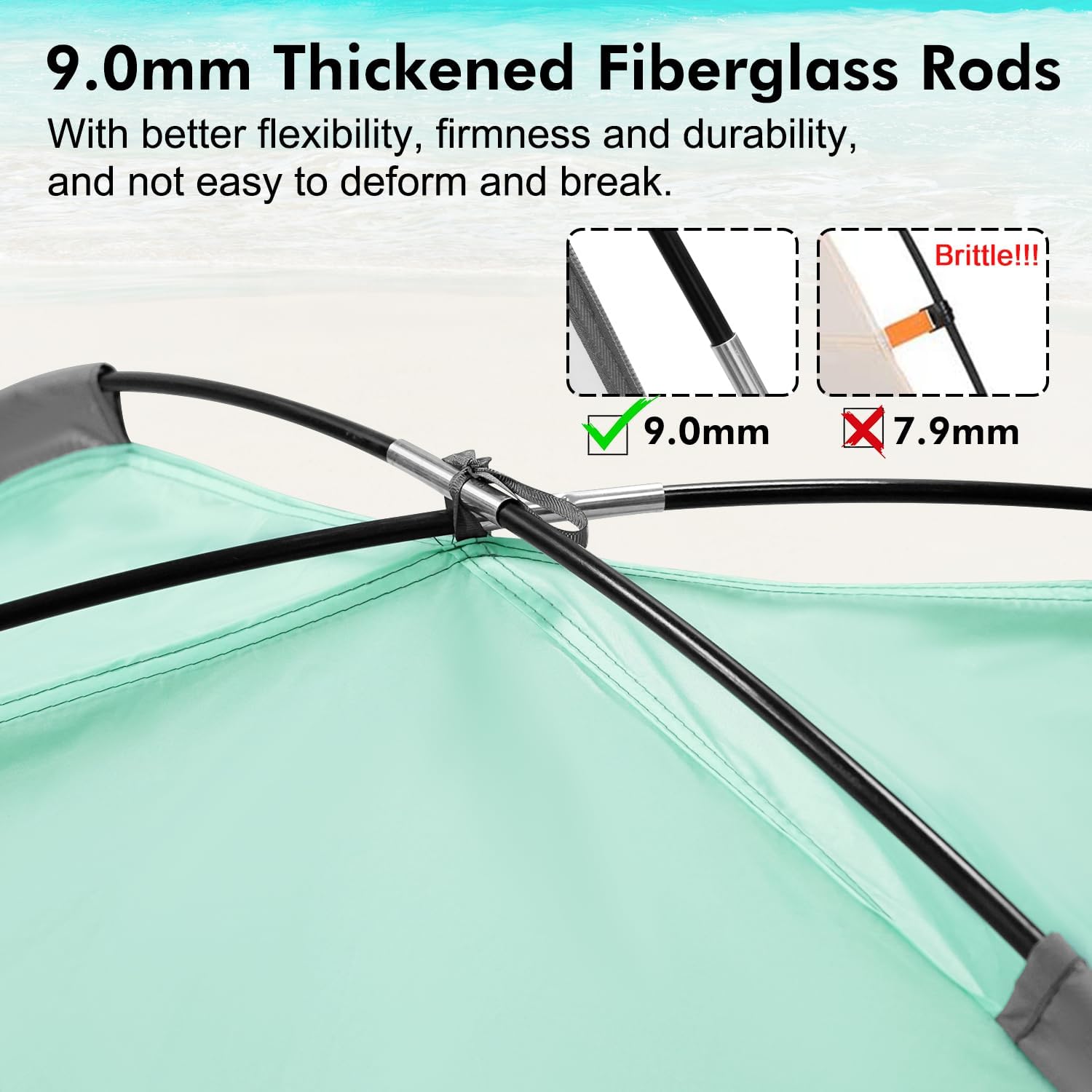 - 9.0mm Thickened Fiberglass Rods: We increased the thickness of the fiberglass rods to 9.0mm to make it more flexible, sturdy and durable. It can support the tent more stable and will keep shape even after long time use.