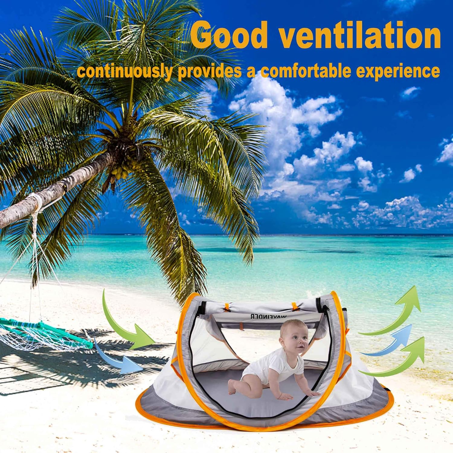 - Protected-190T polyester PU coating and water proof UV50+ baby travel tent, (SGS lab tested)great to keep your kids safe from the sun, the dense white mesh prevents any tiny mosquitoes and bugs