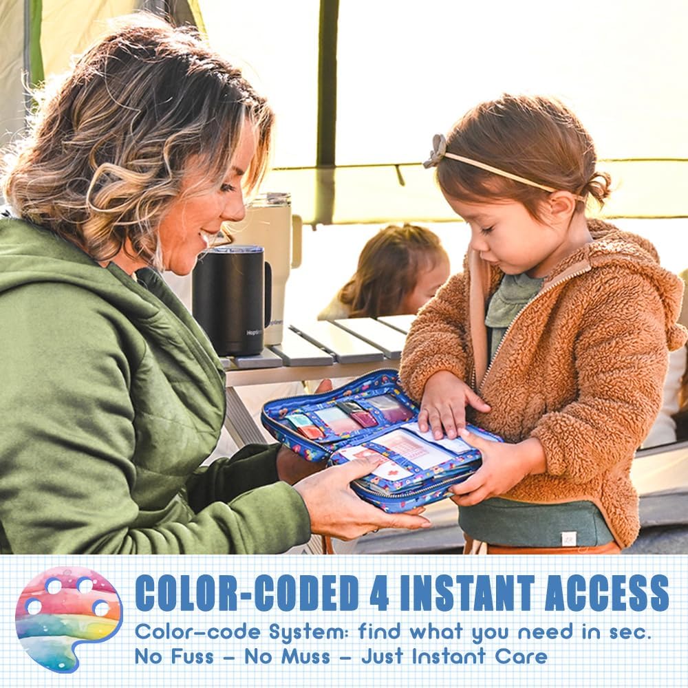 - 🌈 Travel-Friendly Organization: Our first aid kit is meticulously designed to ensure quick access during travel emergencies. Our supplies are neatly organized in designated compartments, all in one compact and portable storage bag, allowing for quick grabs during emergencies, making it perfect for parents on the go!