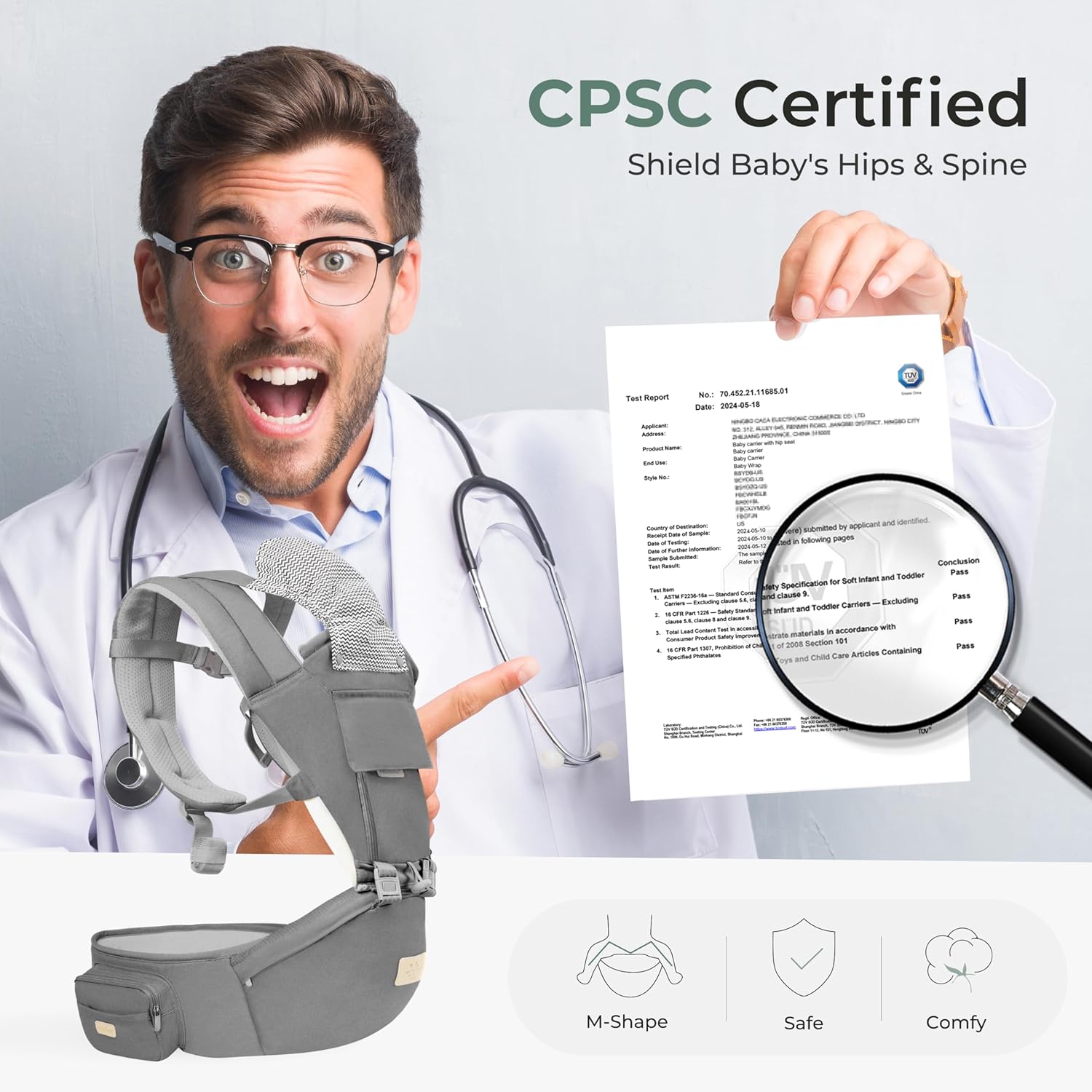 FRUITEAM 6-in-1 Baby Carrier with Waist Stool/Hip Seat for Breastfeeding, One Size Fits All - Adapt to Newborn, Infant & Toddler (Greyish)