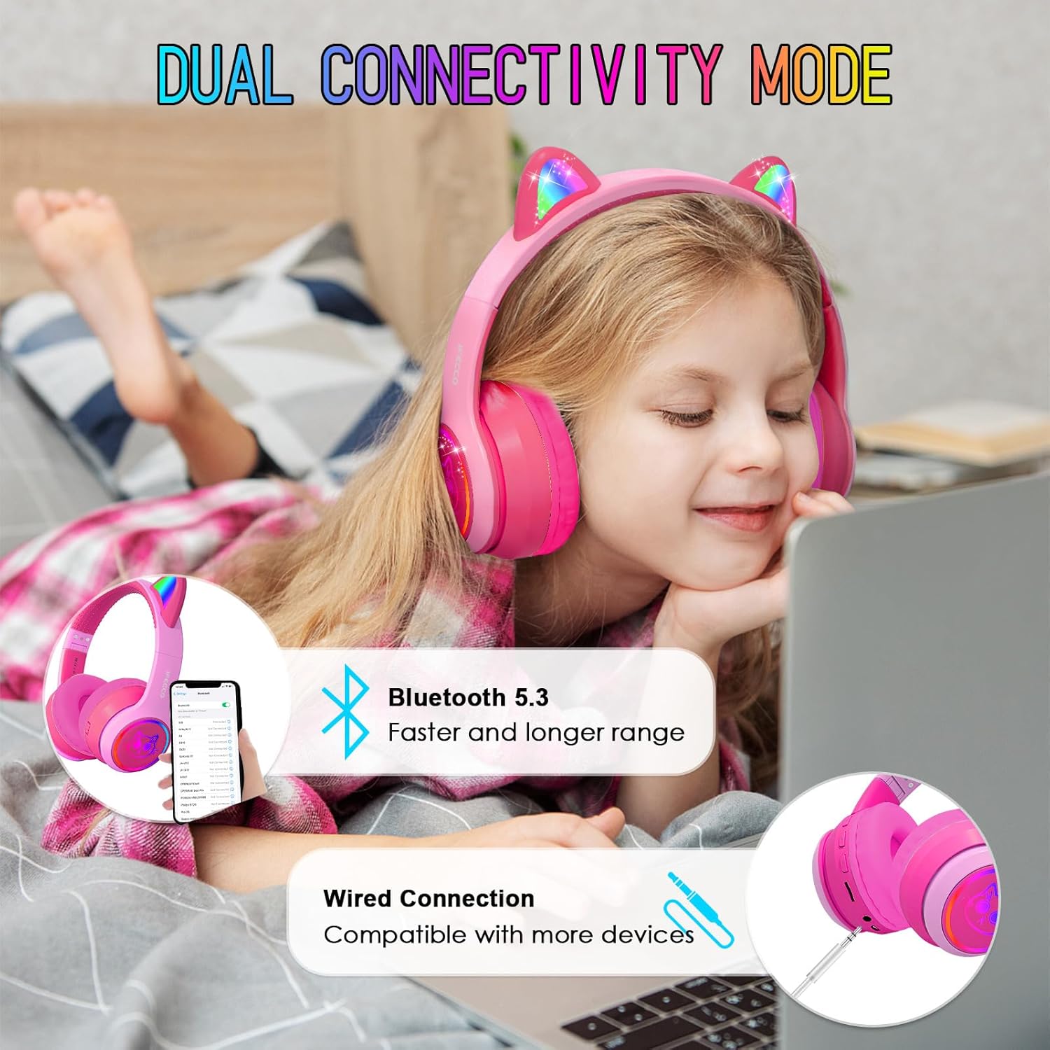 IFECCO Kids Bluetooth Headphones with Microphone,Cute Light Up Cat Ear Children Girls Wireless Headphones Volume-limiting for School Travel Gifts