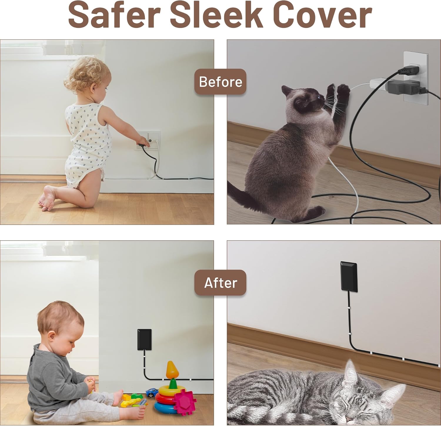 - ✅Safety Protection Cover:Sleek ultra-thin cover perfectly covers the electrical outlet,effectively protects curious children and pets;Included cord concealment kit secures extension cords to the wall,avoiding the risk of exposed outlets or tangled cords