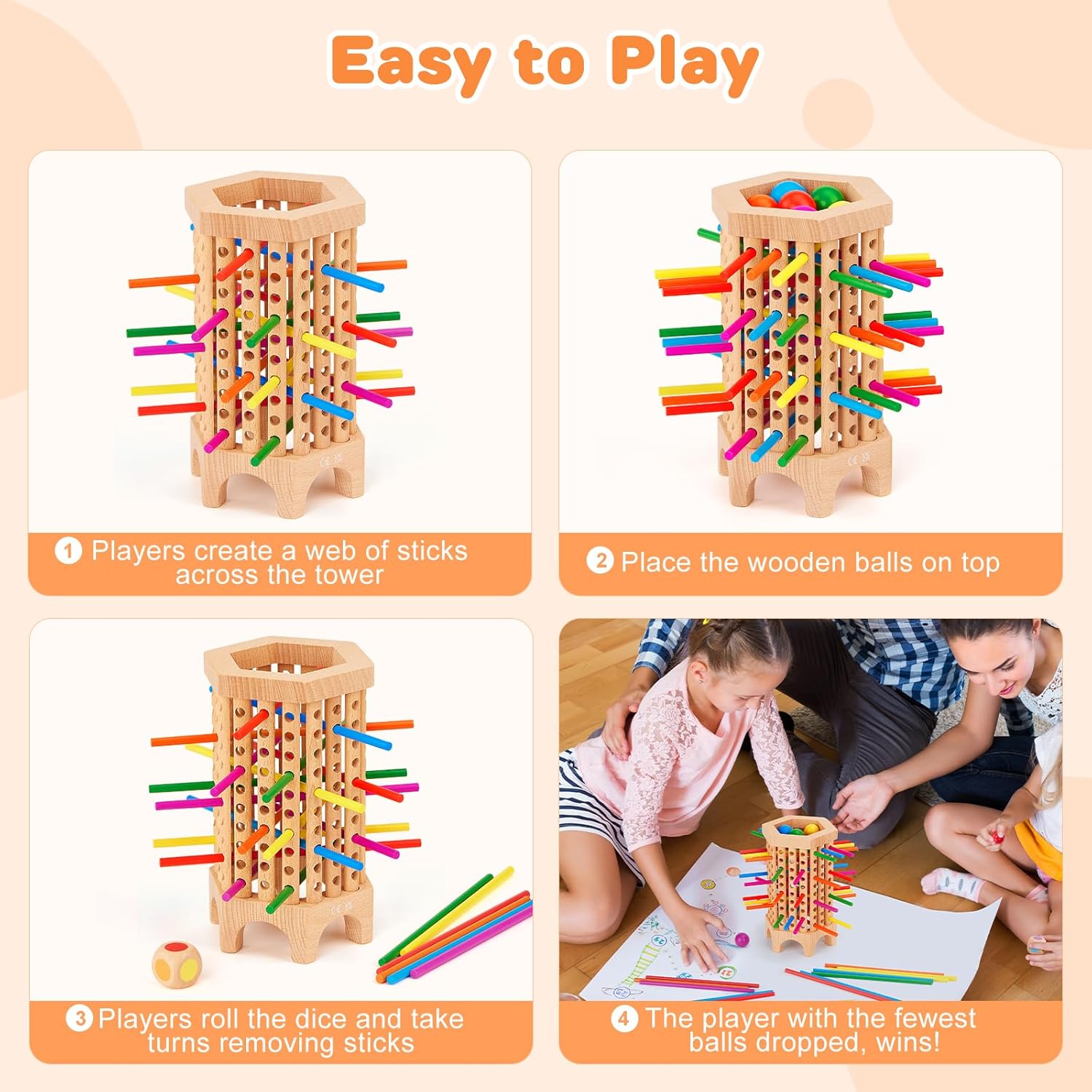 - Educational & Skill-Building Fun: Designed for early learners (ages 3-6), the colorful wooden sticks help with sorting, counting, and critical thinking. Players carefully remove sticks without letting the balls fall, boosting focus, strategy, and hand-eye coordination.