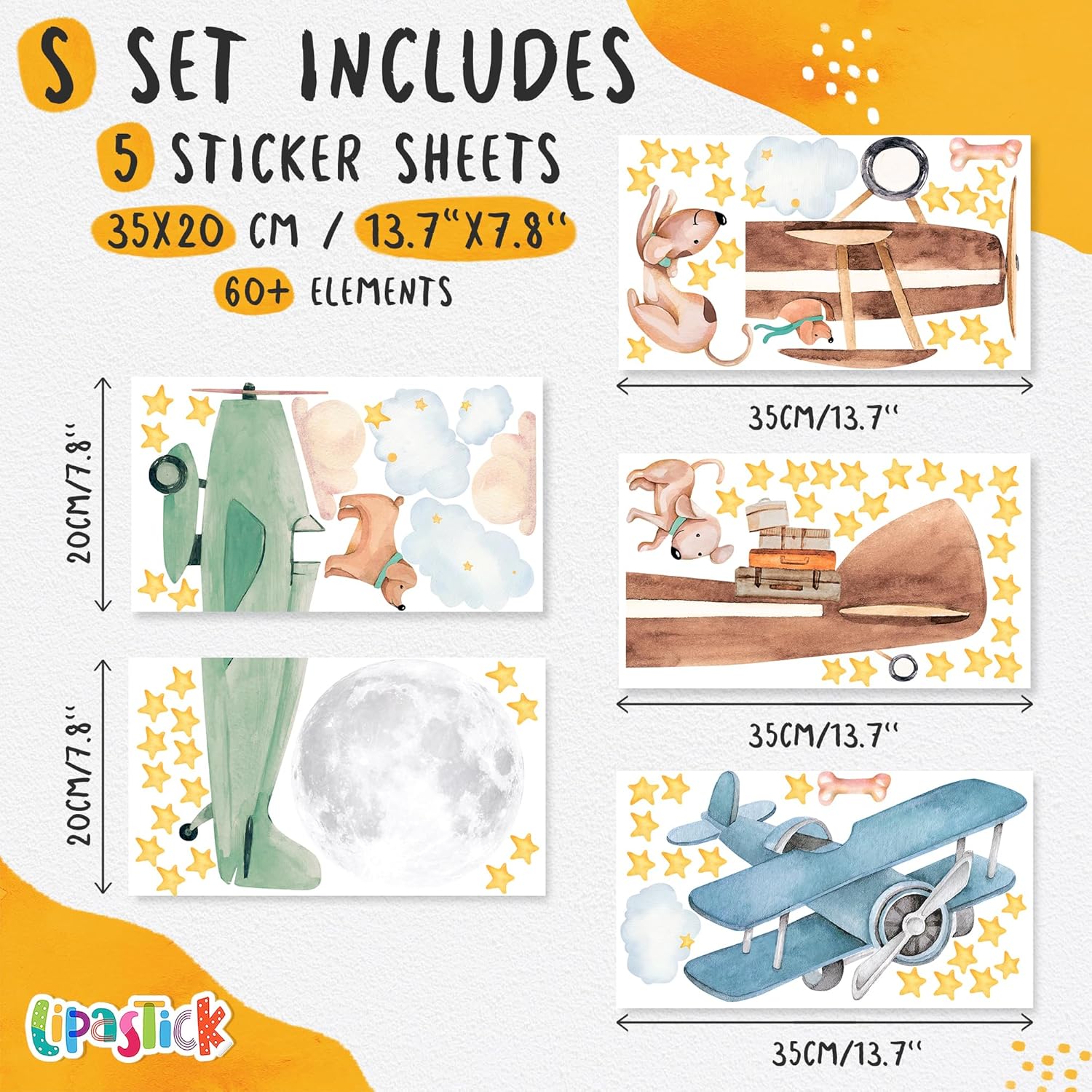 - ✈️ Package Content: Airplane classroom decor comes in a pack of 5 sheets. Includes: airplane, stars, dogs and clouds. The sheet size is 13.8" x 7.8". This set of airplane decals for boys room is size S.
