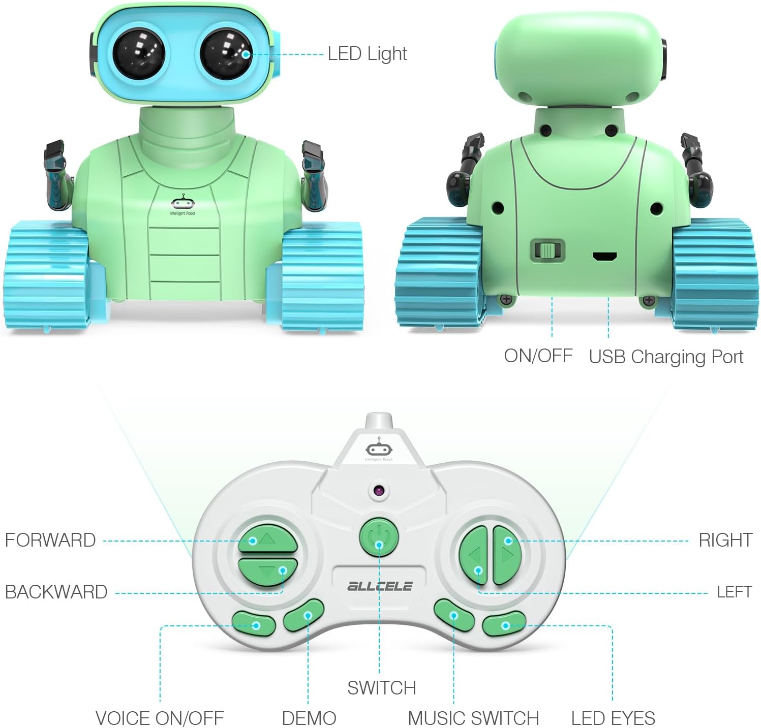 ALLCELE Robot Toys, Rechargeable RC Robots for Kids Boys, Remote Control Toy with Music and LED Eyes, Ideal Gift for Children-Green Blue