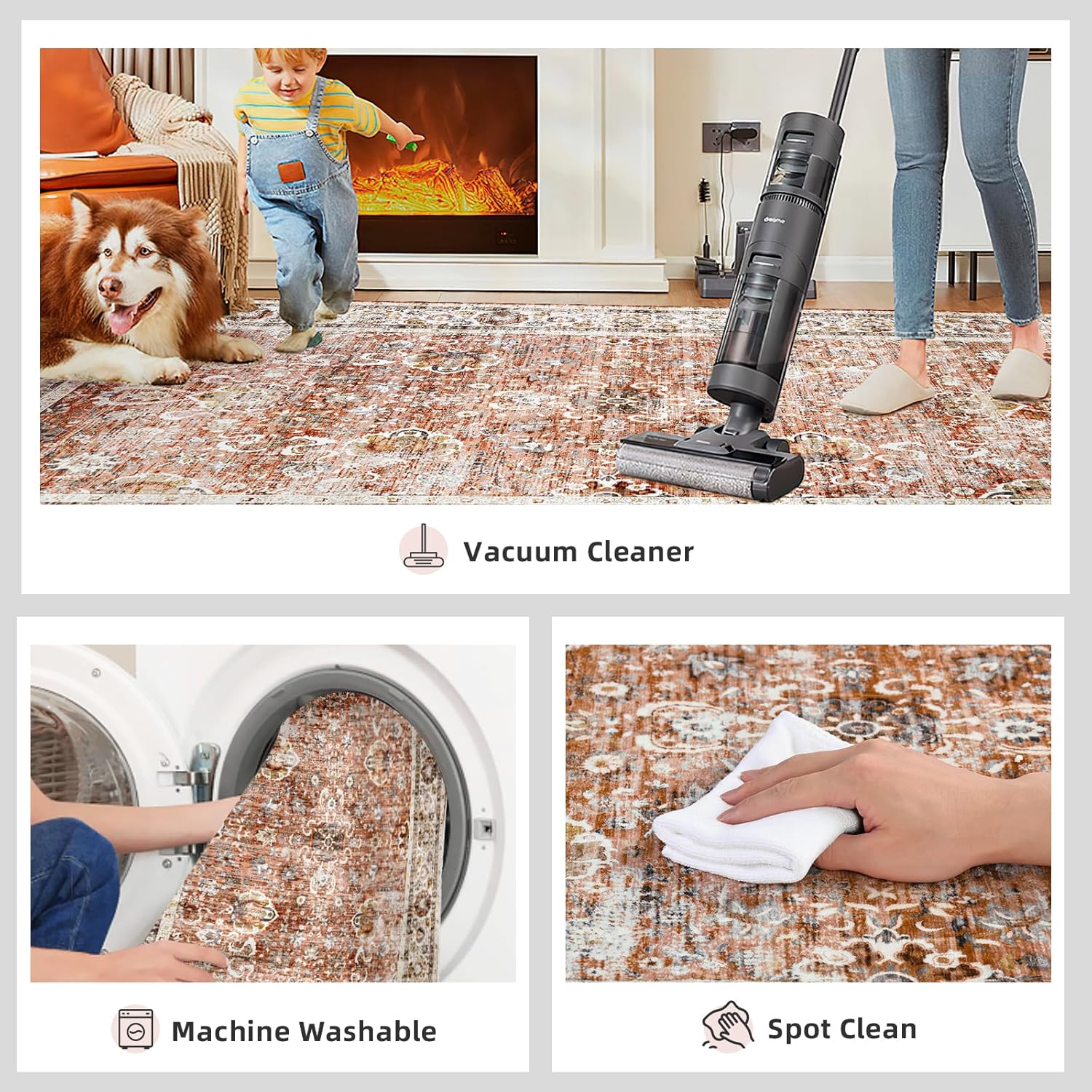 3x8 Runner Rug Non Slip - Kitchen Washable Rug Runner with Non-Shedding, Boho Rugs Cream Runners Rug for Hallways Distressed Carpet Runner Rugs for Bedroom Brick Red