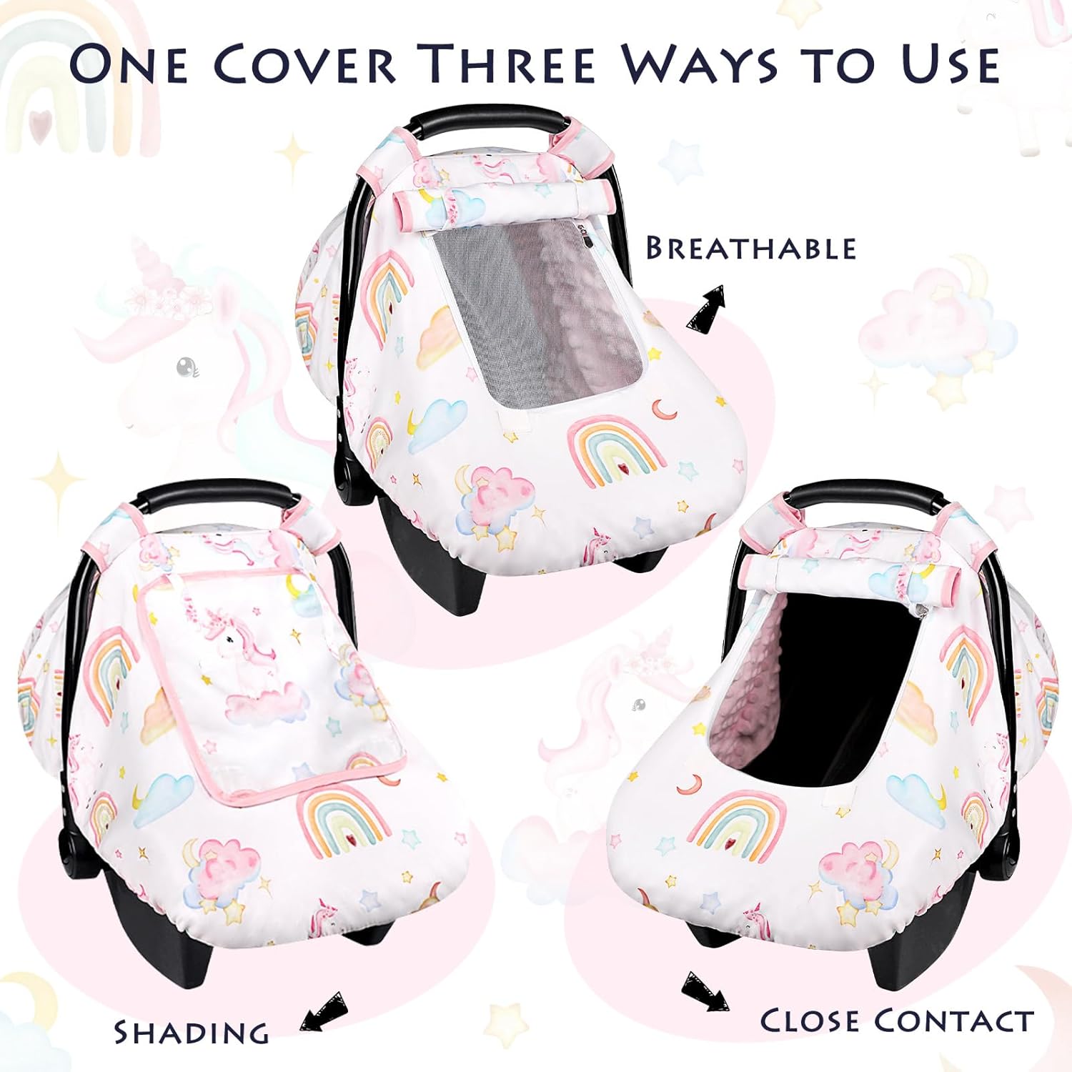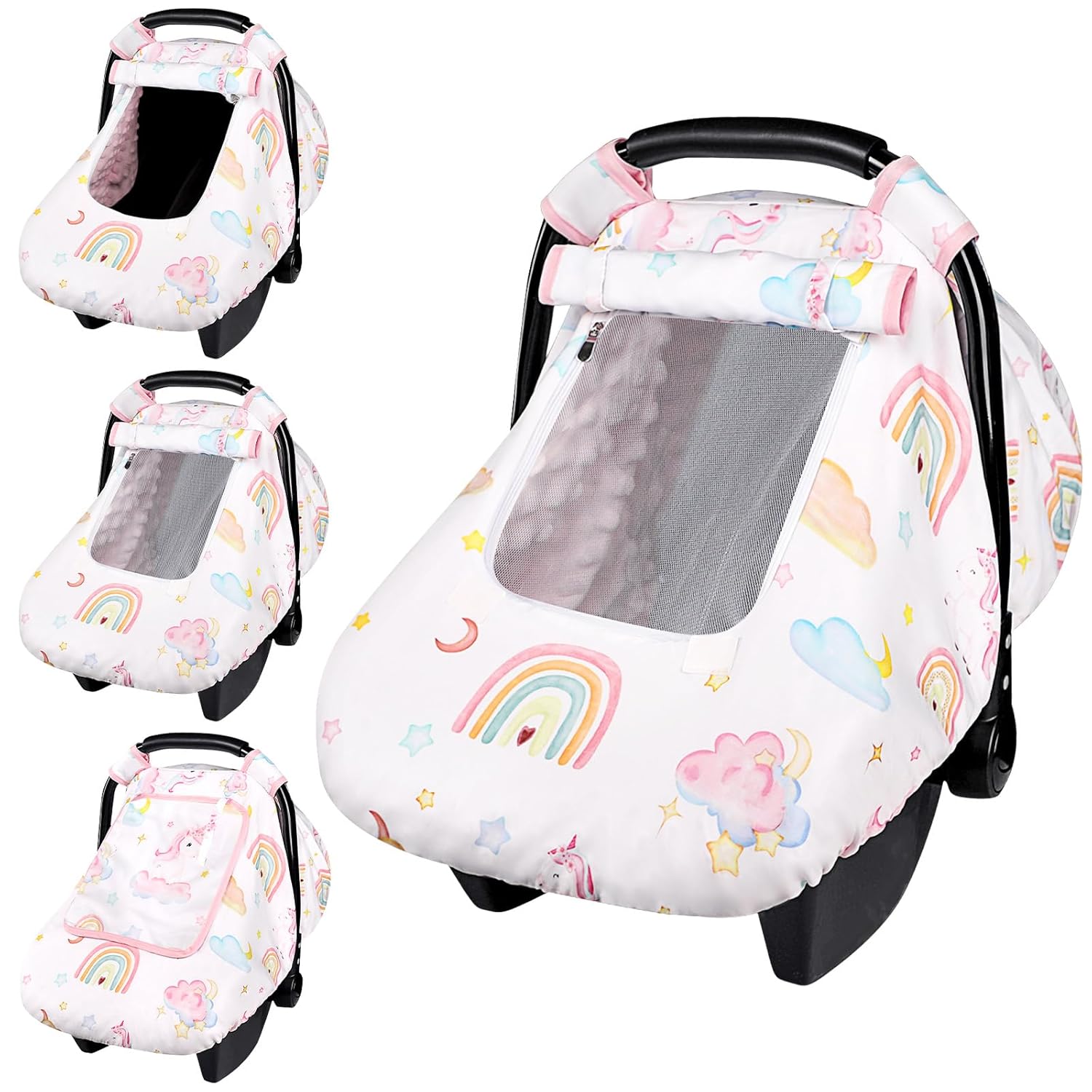 Baby Carseat Cover Girls, Pea Pod Unicorn Infant Car Seat Covers Canopy for Newborn with 2 Layers Windows of Breathable Mesh/Fabric, Lightweight Polyester/Minky Dot Backing, Snug Fit