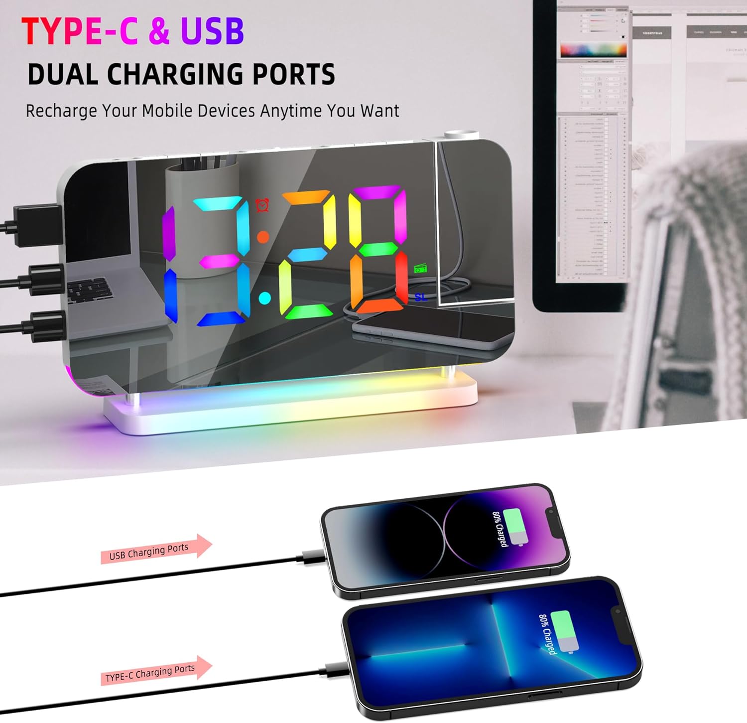 Projection Alarm Clock for Bedroom Ceiling,RGB Digital Clocks with 10 Colors RGB Night Light,Loud Alarm Clock for Heavy Sleepers,USB C Charger Port,Snooze,12/24H,Auto Dimming