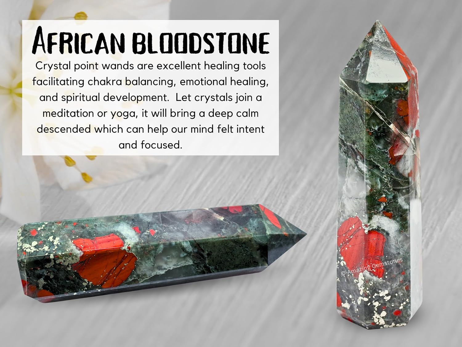 - African Bloodstone Crystal wand configuration enhances the metaphysical and healing properties of the source crystal. A crystal point is a powerful crystal tool. When placed facing away, the crystal point directs energy outward.