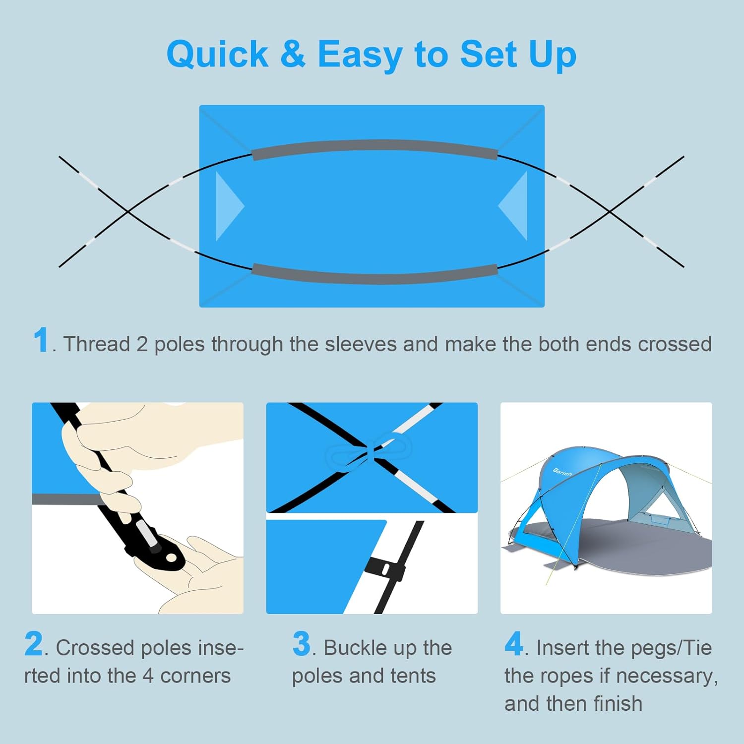- Stable and Durable Construction: Equipped with sturdy 8mm thickened poles, 4 sandbags (2 on each side), 8 stakes (including 4 ground stakes and 4 plastic stakes), and 4 wind ropes, the tent can withstand 3-4 level wind forces to remain stable and secure, ensuring reliable windproof performance for your beach adventures