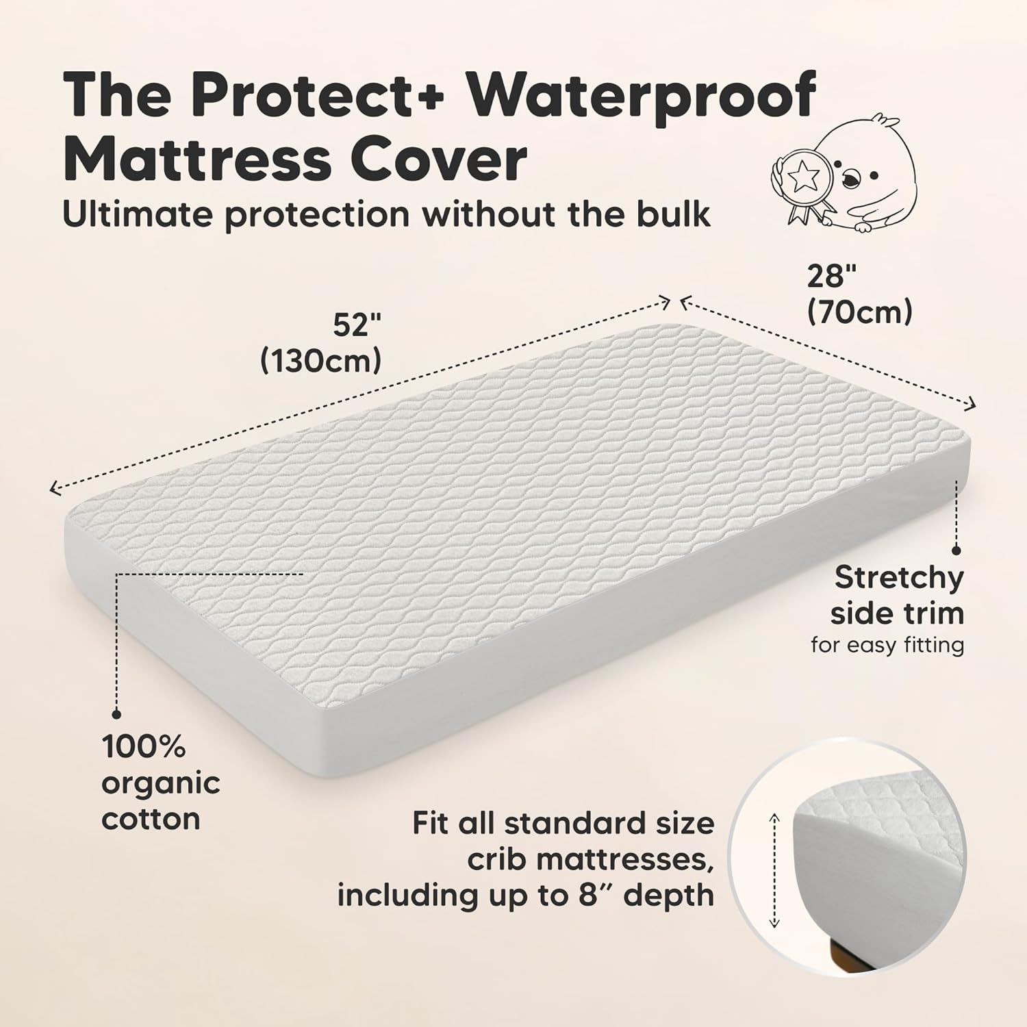 - Easy Fit - Our 52" x 28" x 8" toddler mattress protector sheets, fit well on standard size crib mattress, come with elastic hem for a snug, secure fit. Lightweight, easy to put on & remove, crib mattress topper for fuss-free crib mattress cover change