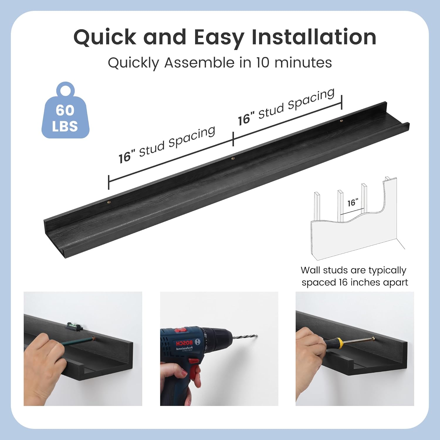 Picture Ledge Wall Shelves 48 inches Width Set of 3, Solid Pine Wood Rustic Floating Ledge Shelves for Wall for Kids' Room Bedroom Kitchen Bathroom Long Floating Shelves for Wall Decor, Black