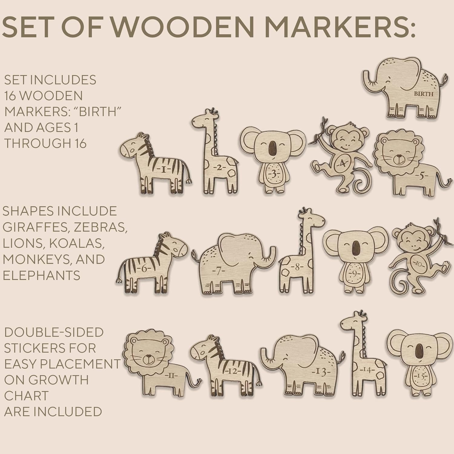- SET INCLUDES: 16 wooden markers: "birth" and ages 1 throught 16, shapes include elephants, giraffes, monkeys, lions, koalas, zebras