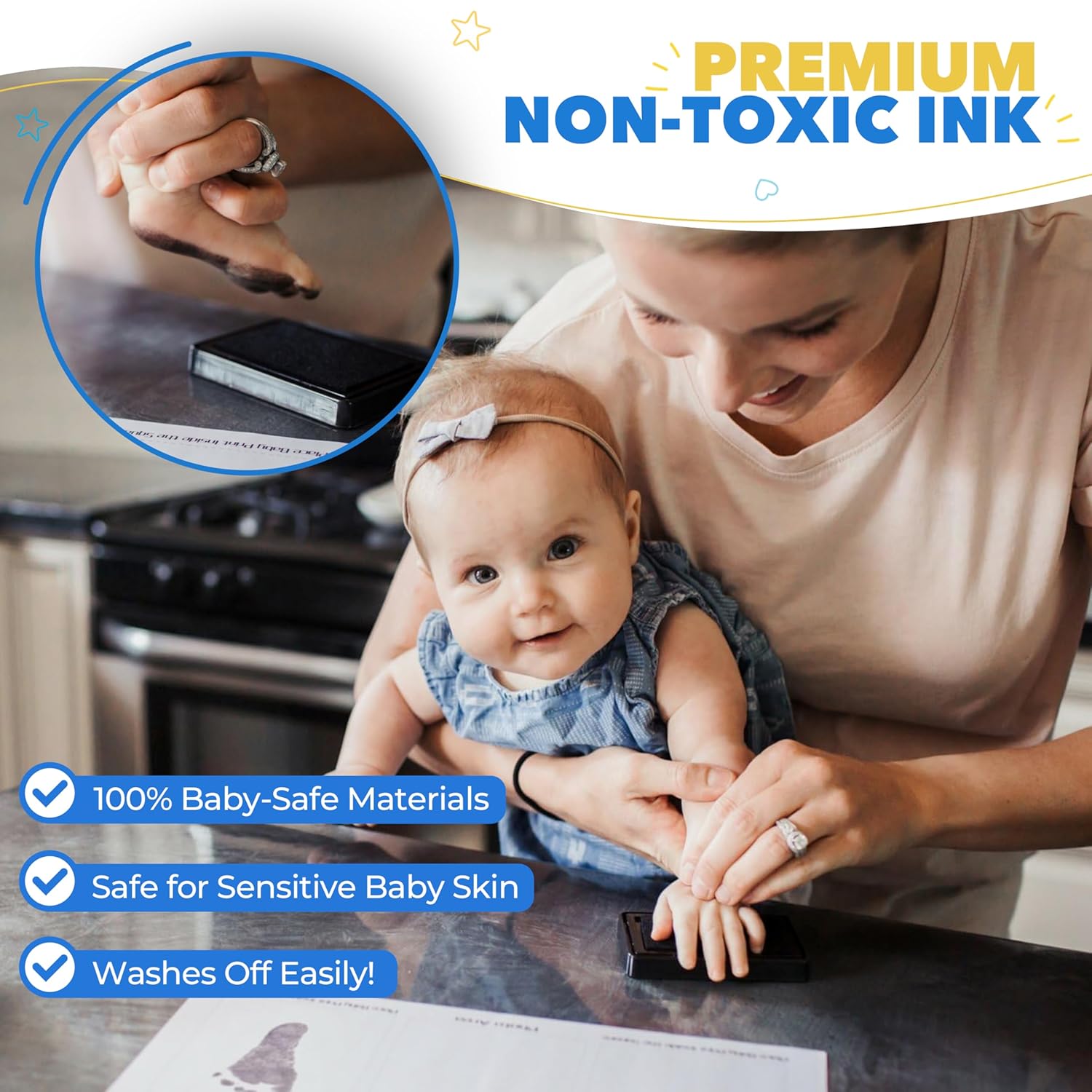 - Easy to Use & 100% Baby Safe: Rest assured that our baby ink hand & footprint kit is 100% safe for your little one. The ink for baby handprint & footprints in our kit has a bigger ‘inker’ ink pad to really define the cute lines of your baby’s hand & foot.