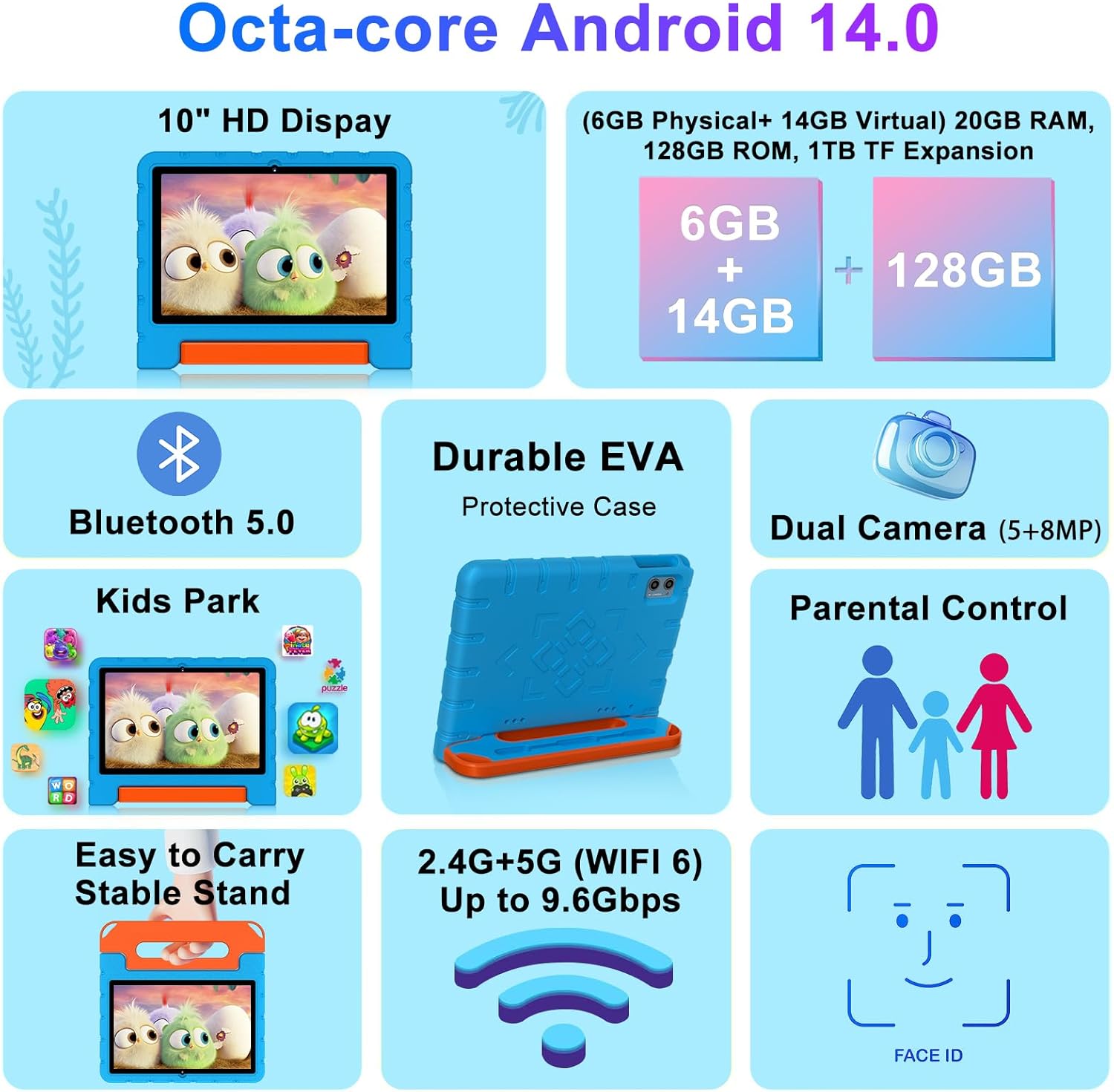 2025 Kids Tablet 10 inch Android 14 Tablets for Kid Octa-Core, 20GB+128GB (TF 1TB), Toddler Tablet with Shockproof Case, 2.4G+5G WiFi 6, Parental Control, Face Unlocked, Split Screen, BT5.0 (Blue)