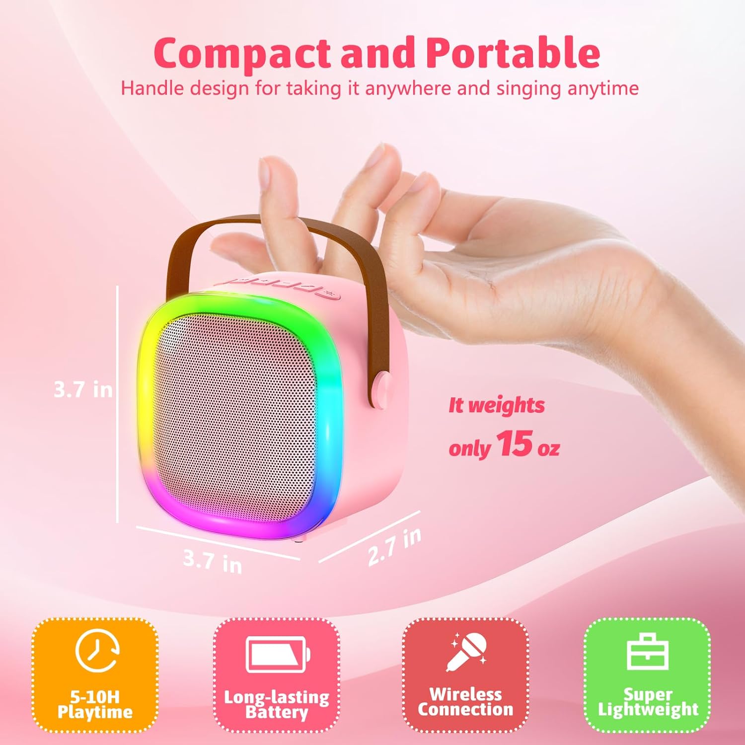 - Compact and Portable-Mini kids karaoke system is designed with a durable handle,which is lightweight, wireless and highly portable.Perfect for family gatherings, birthday party, school activities,travel etc.Ensuring endless fun and creativity for children while the colorful LED lights sync to the music, enhancing the party atmosphere