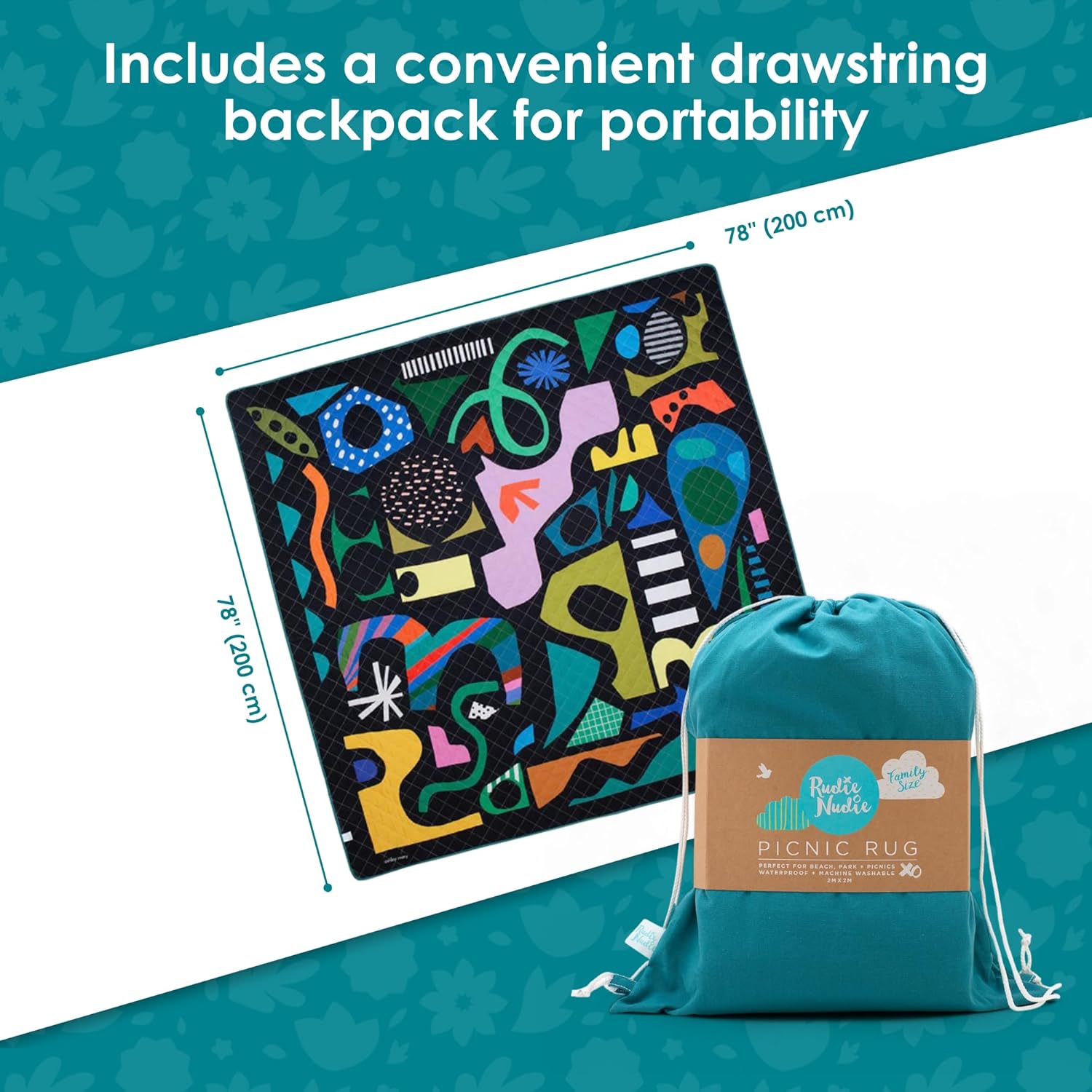 - Jumbo size for family fun: Measuring a generous 78” x 78” (200 x 200 cm), the picnic blanket offers ample space for the entire family to relax and enjoy. It's ideal for group picnics, beach days, or any outdoor activity needing a large, comfortable seating area.
