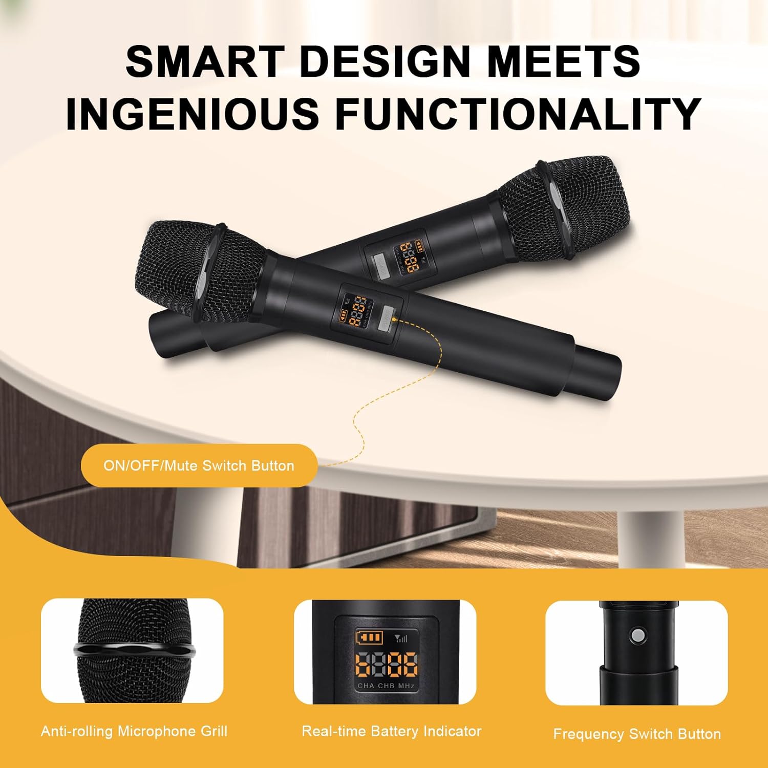 - USER-FRIENDLY DESIGN: The dynamic handheld microphones feature a diamond-edged design that prevents rolling, keeping them securely in place on any surface. The main unit’s clear screen display prominently shows channel assignments, making it easy to identify and switch between channels. This thoughtful design of the microphone system ensures a seamless, stress-free experience, allowing you to focus entirely on your performance