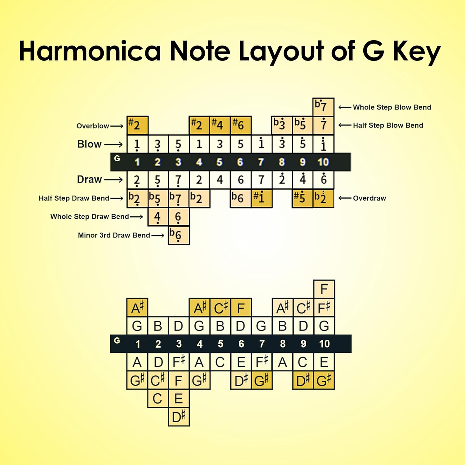 - 10 Holes Diatonic Harmonica: which features 10 holes with reeds tuned to the key of G. It's allowed to play a complete 7-note scale of the key.With advanced playing techniques, you can produce additional notes from outside the scale, adding depth and versatility to your music