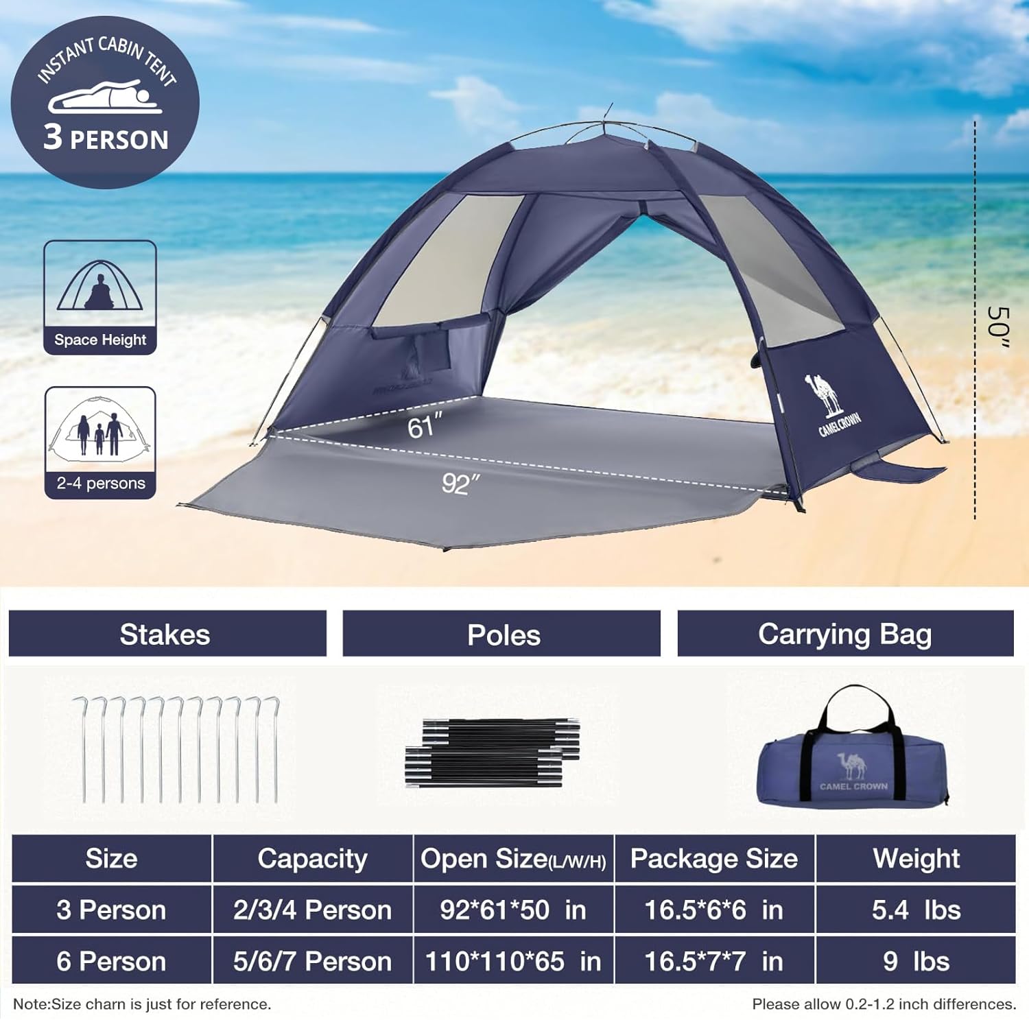 CAMEL CROWN Beach Tent UPF 50+ Sun Shelter for 2/3/5/6 Person, Lightweight Portable Sun Shade with Sand Anchor, Family Beach Day & Outdoor Adventures