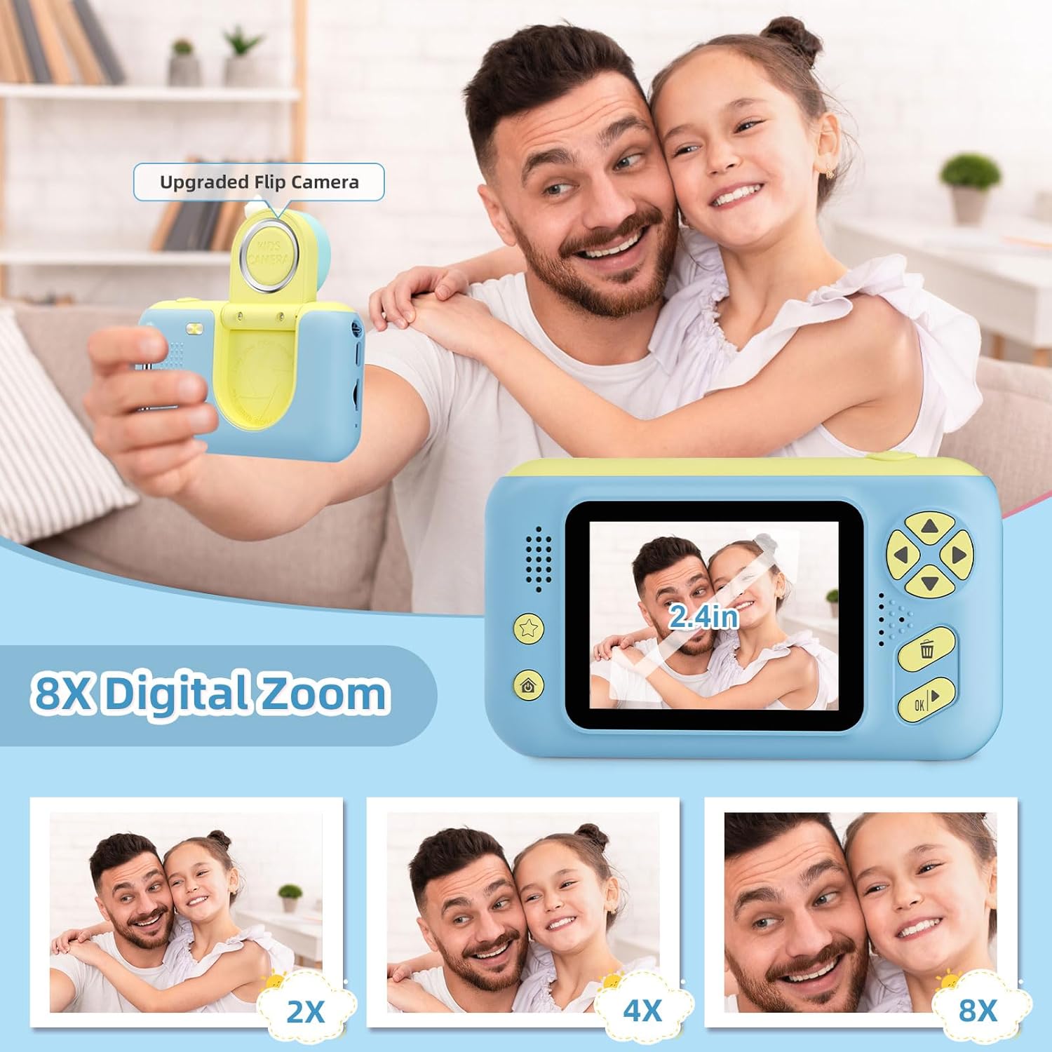 - 【Upgraded 180° Flip Camera – HD Photography & Video】This children’s digital camera features a 180° flip design, perfect for selfies and creative shots. Equipped with 8MP and 1080P HD video recording, it captures clear, vibrant photos and videos. The 2.4-inch eye-protection screen safeguards kids' delicate eyes during long viewing sessions, making it the best camera for kids with eye protection.
