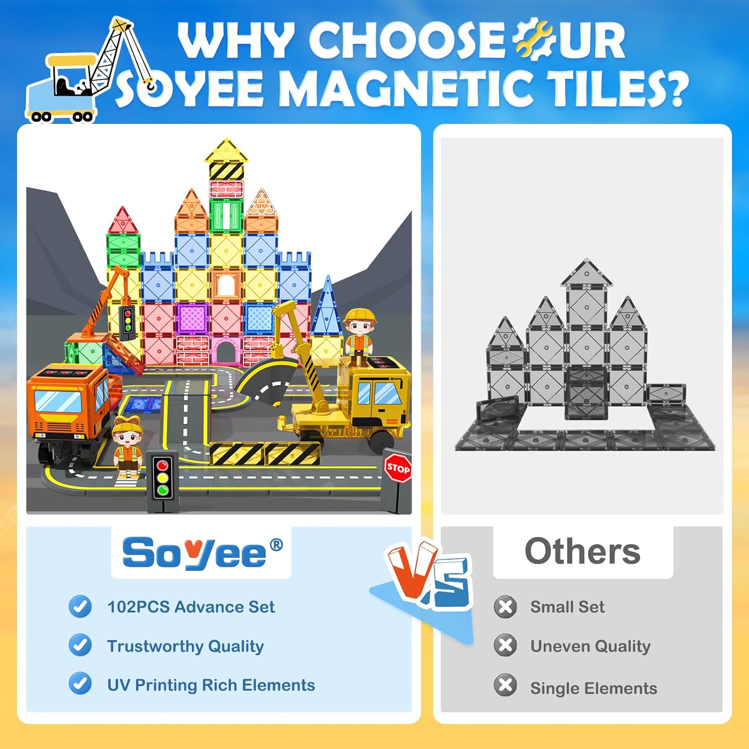 - 【QUALITY YOU CAN TRUST】 SOYEE magnet toys are made of ABS material and use stronger magnets. The set contains rich elements such as cranes, engineering vehicles, roads, traffic lights, enclosures, and magnetic figures. The crane magnetic tile can be rotated and telescopic, which is extremely operational