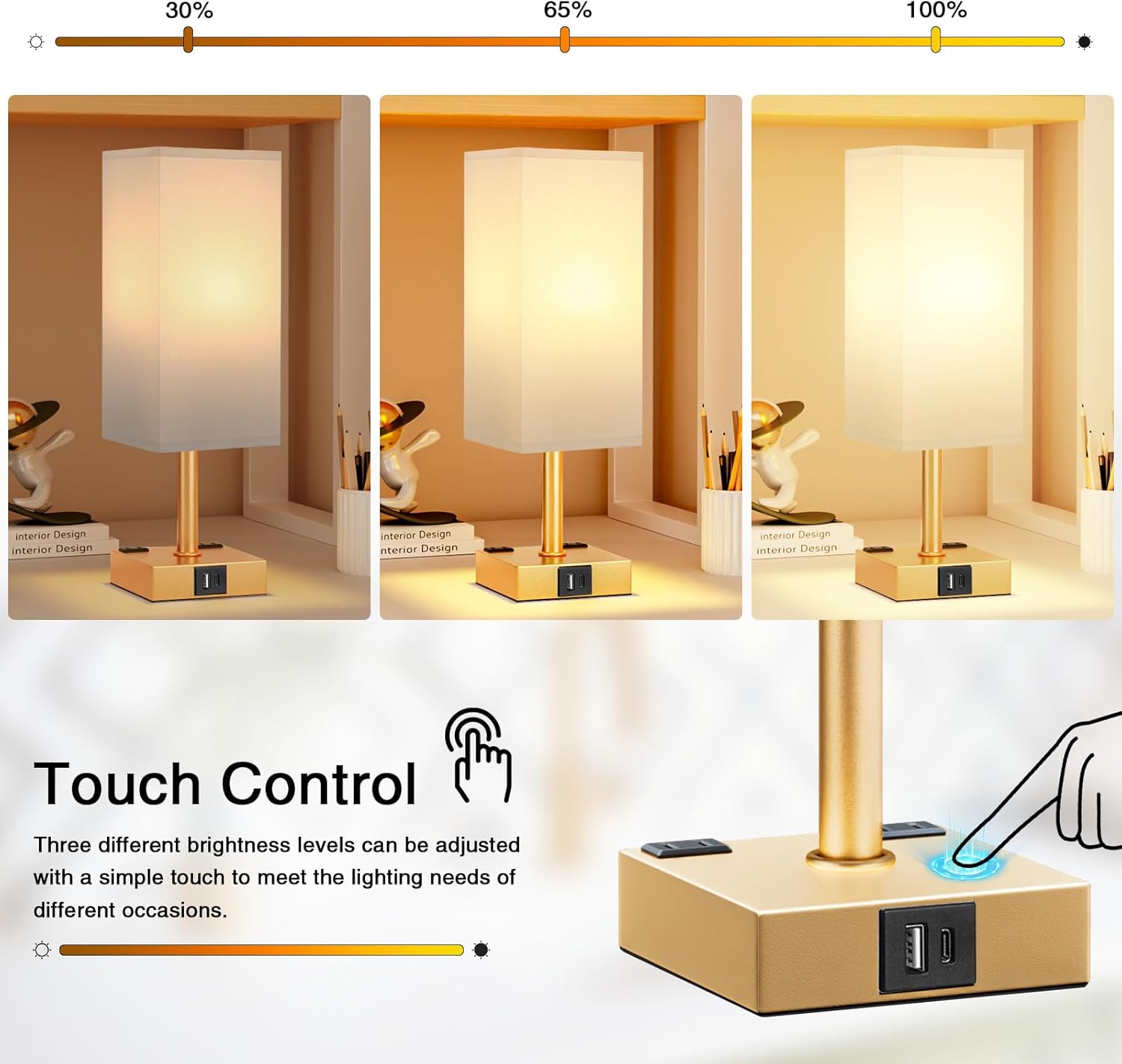 - 3-Way Dimming Touch Lamp for Bedroom - The GOLD bedside table lamp has a built-in sensitive touch sensor that allows you to smoothly switch between three different brightness levels with a simple touch on the metal base. Low brightness soft lighting creates a cozy and quiet atmosphere. Medium brightness is moderate and helps to concentrate on study and work. High brightness lighting ensures clarity for fine visual tasks