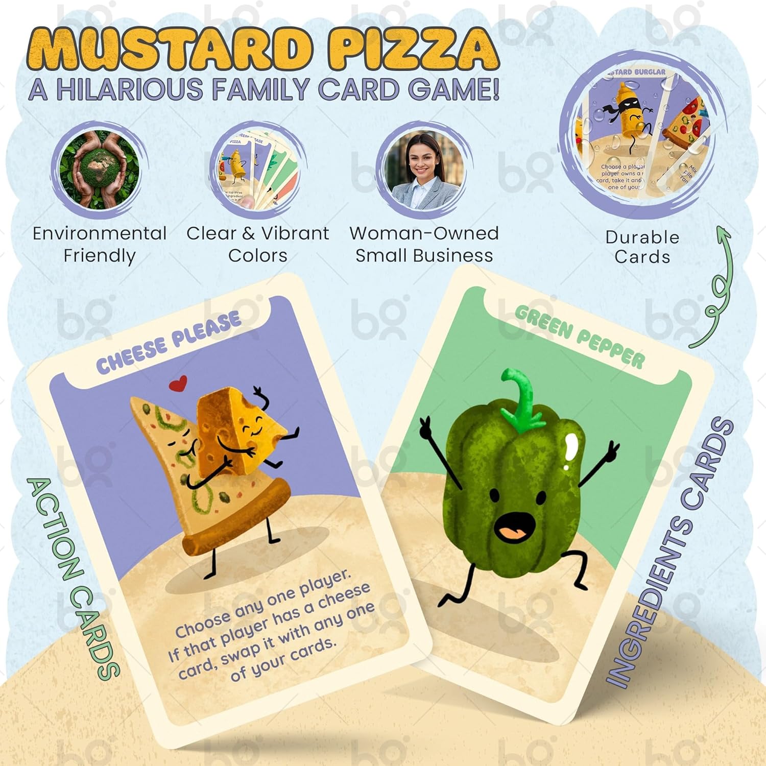 - PIZZA MAYHEM AWAITS! - Mustard Pizza is a fast-paced family card game where players race to craft the ultimate pizza with a mix of ingredients and action-packed twists! Compete to build the ultimate pie with wild toppings and unexpected twists in every turn!