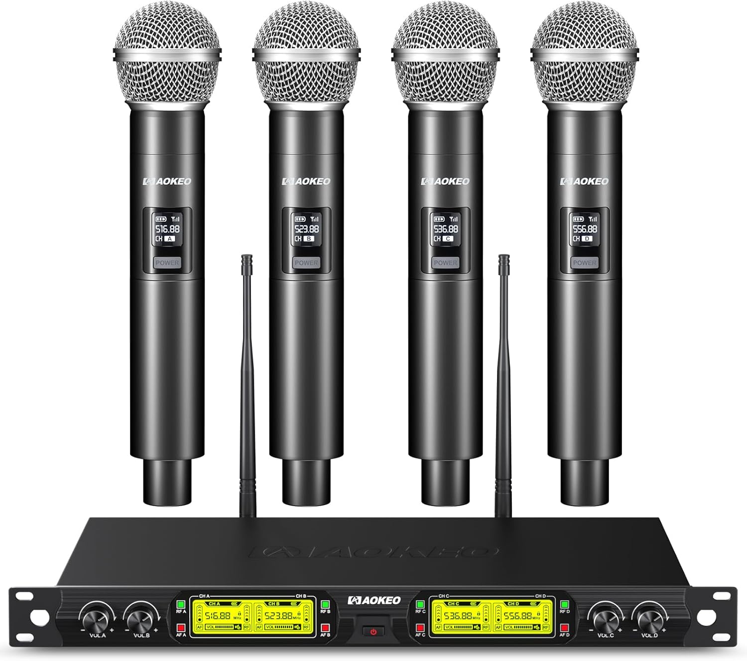 Aokeo Wireless Microphones System, 4 Channel UHF Wireless Mics,with 4 Handheld Dynamic Microphones,Metal Receiver for Karaoke,Singing,Wedding,Party,Speech,Church