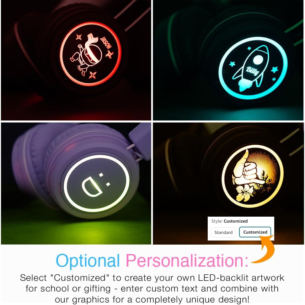 - LIGHT-UP DESIGNS & 4 AUDIO MODES: multicolor LED lights with 8 color patterns illuminate the graphics on each ear cup, giving each KidJamz headphone a vibrant and unique style; optional customization with a personalized name, graphic, or logo is also available; plus, 4 distinct audio modes let kids further personalize their listening experience at the touch of a button
