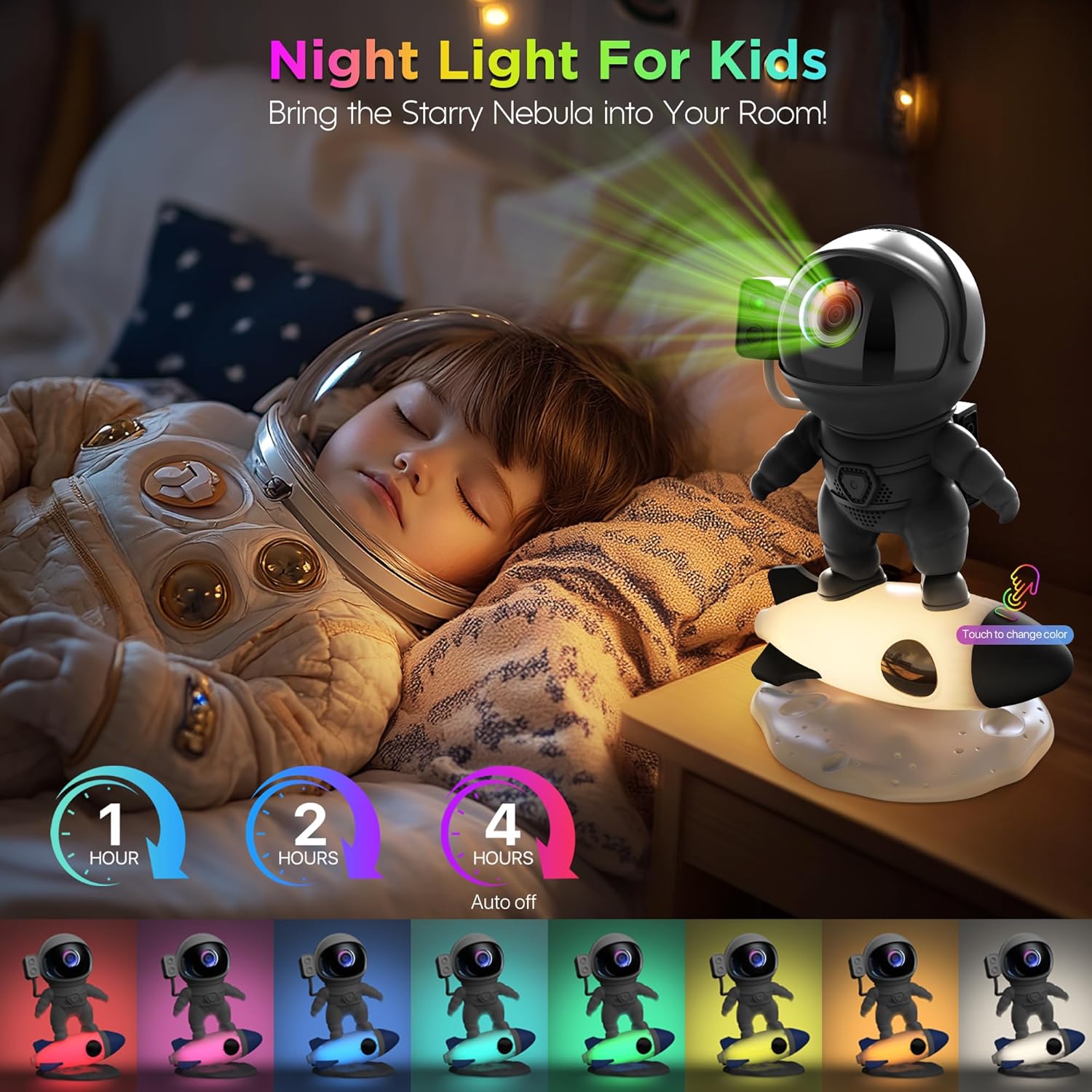 - 【4 in 1 Upgraded Astronaut Projector Night Light】: Galaxy projector combines a projector, night light, white noise machine, and bluetooth speaker all in one device, rocket-shaped night light featuring 9 colors, astronaut galaxy projector combines 10 stunning nebula effects with twinkling green stars, cast the wonders of the galaxy onto your room's walls or ceiling, achieve 4-level flow speed and brightness via the included remote controller or APP, creating a serene and relaxing ambiance perfect for movie nights, date nights, or gaming and room decor.