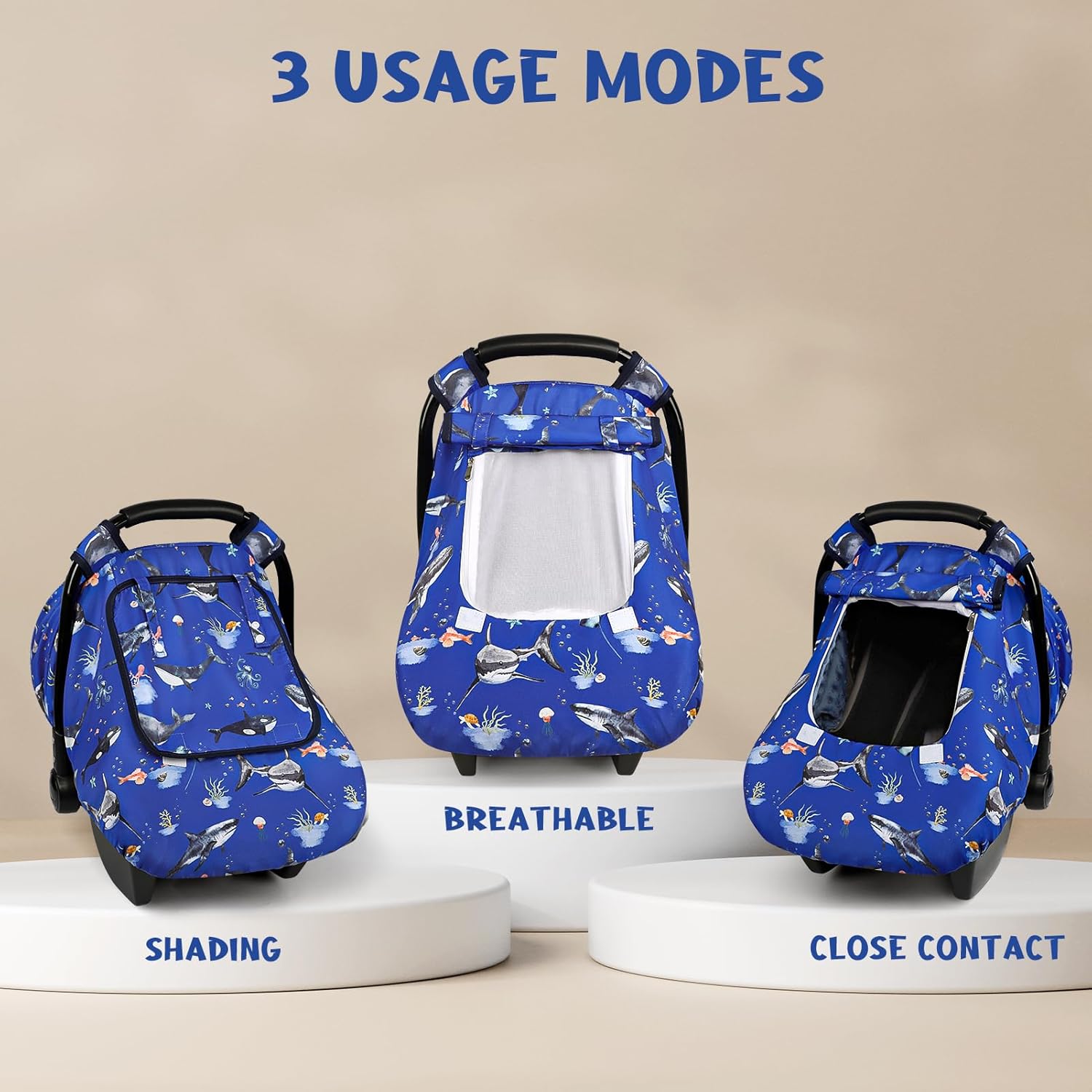 Pea Pod Car Seat Cover Baby, Infant Car Seat Canopy Covers for Newborn with 2 Layers Windows of Breathable Mesh Fabric, Lightweight Polyester/Soft Minky Dot Backing (Ocean)