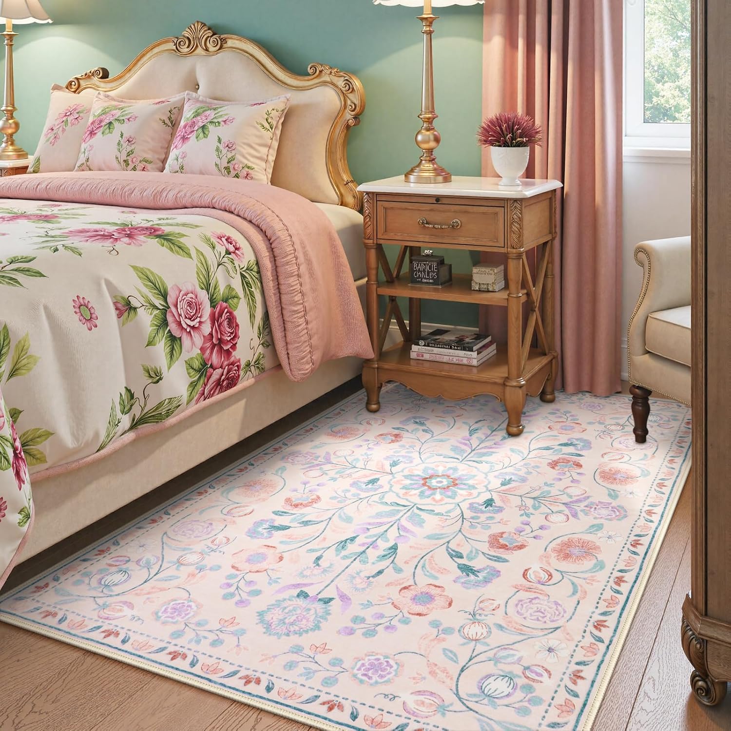 Anidaroel 5x7 Area Rugs for Living Room, Washable Pink Floral Rugs for Bedroom Girls, Soft Boho Nursery Rugs for Kids Playroom, Non Slip Low Pile Indoor Carpet for Bedside Dorm, Pink/Multi