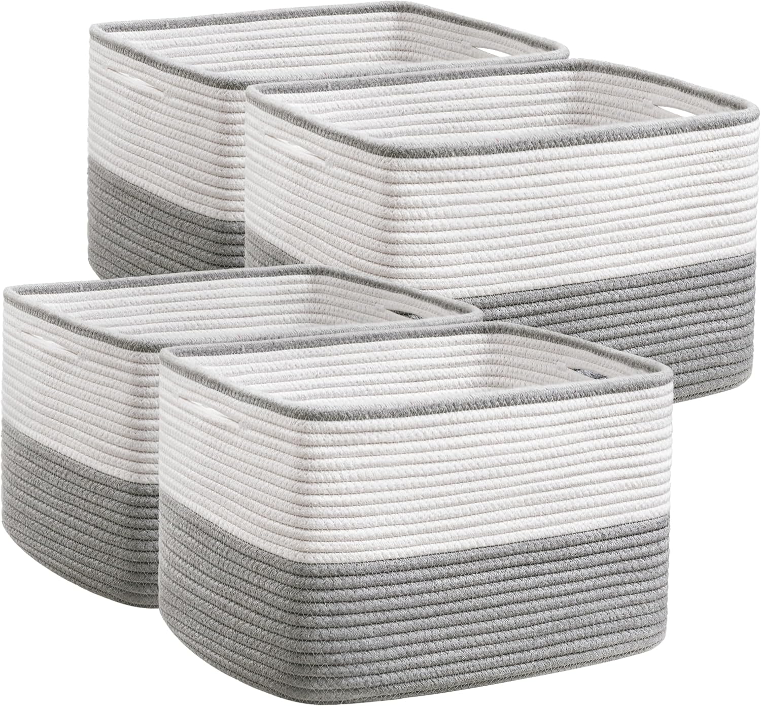 UBBCARE 4 Pack Baskets for rganizing, Woven Storage Baskets for Toys and Towel, Rectangle Cotton Rope Basket with Handles, 15''L x10''W x9''H, Grey