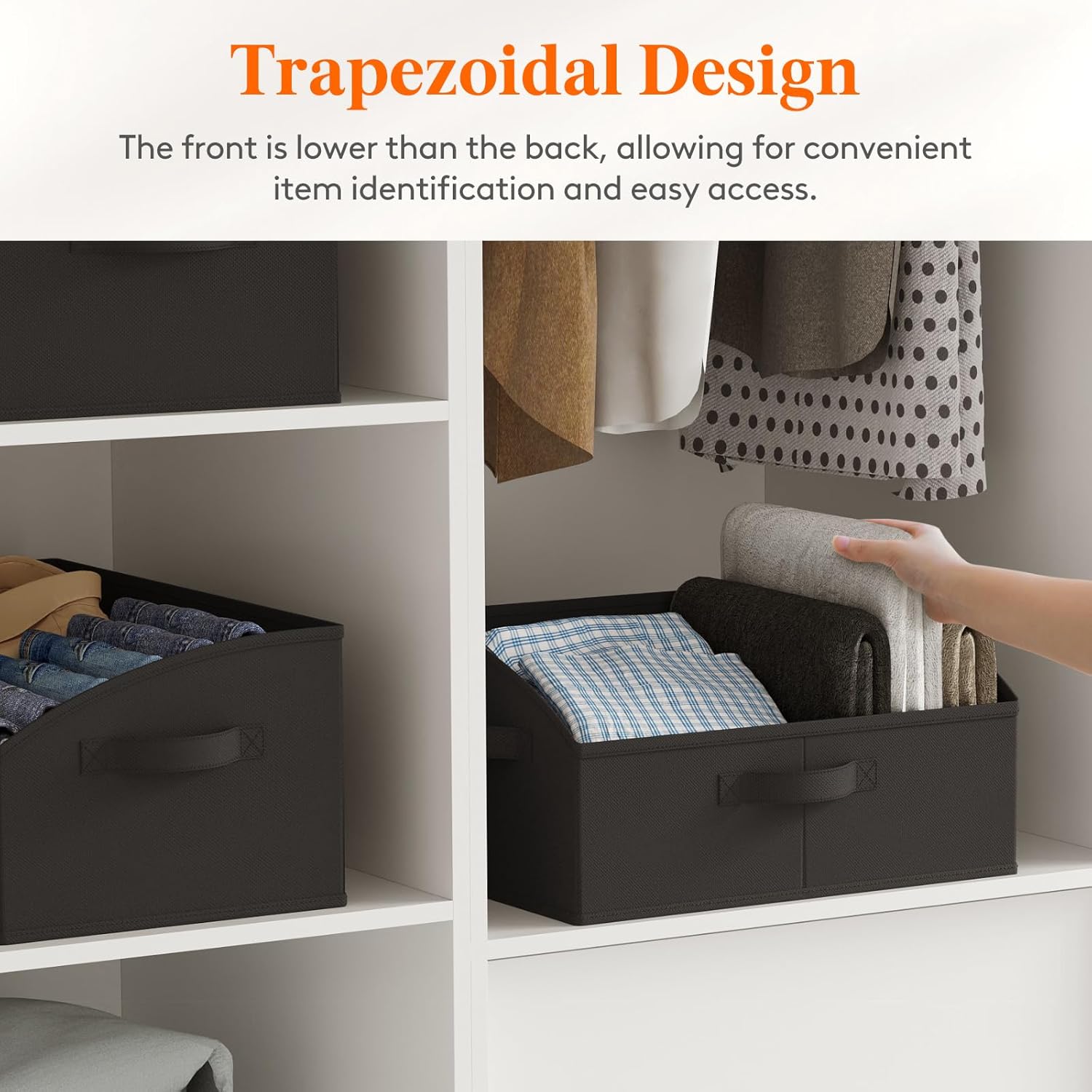 - Open Trapezoid Design: These storage baskets for shelves feature a trapezoidal design with the front lower than the back, providing an unobstructed view and making it easier to see and access items within the basket. This trapezoidal design enhances usability and accessibility, ensuring a clutter-free and organized storage solution.